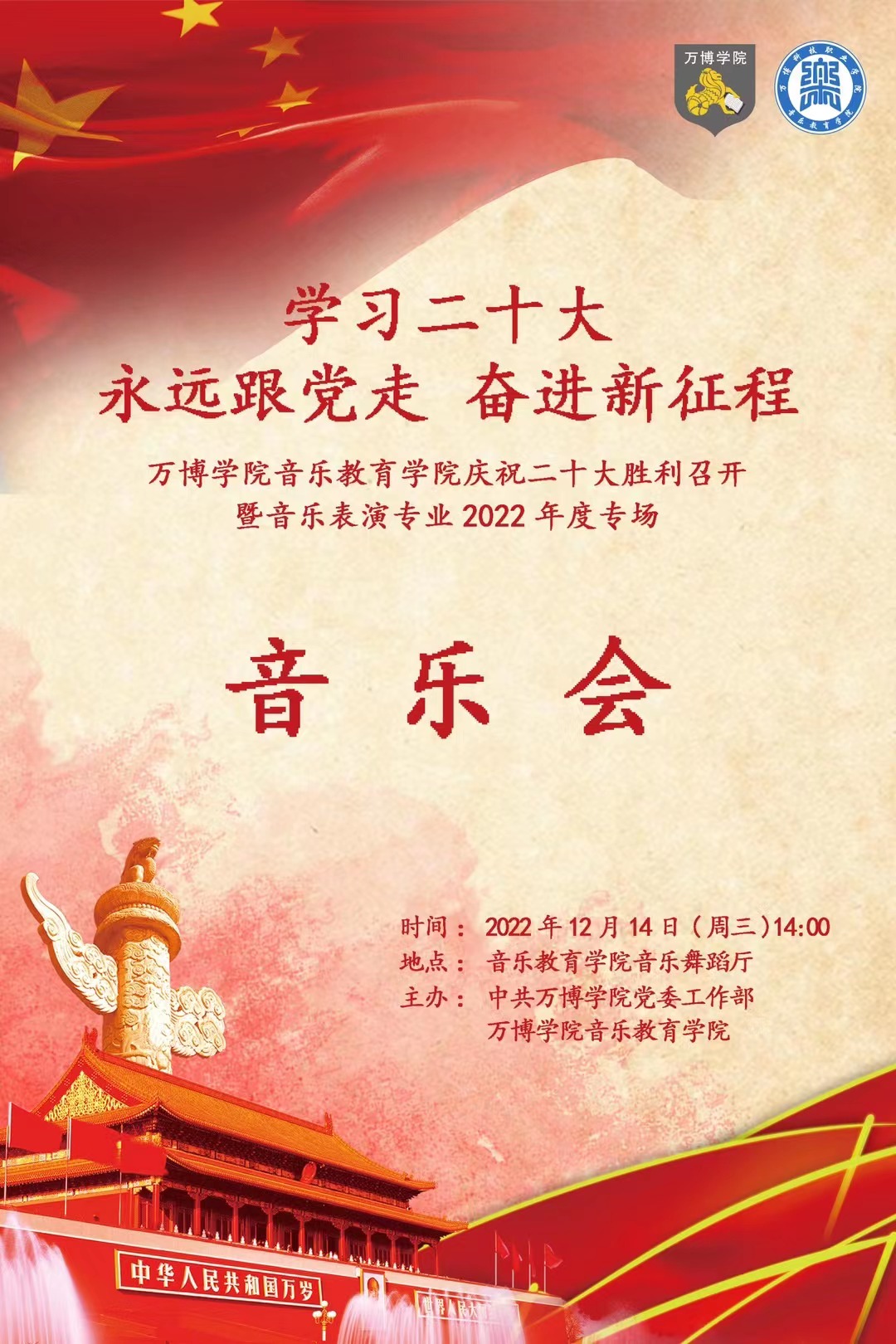 12月14日下午,BEAT365英国官网“学习二十大 永远跟党走 奋斗新征程”专场音乐会在音乐舞蹈厅成功举办。省教育厅督导专员、学院党委书记鲍习生,党委副书记、执行院长张进,副院长耿瑜,副院长马赞出席音乐会,学院党委委员、相关部门负责人及音乐表演专业全体师生观看了演出。本次活动由学院党委工作部主办,音乐教育学院承办。