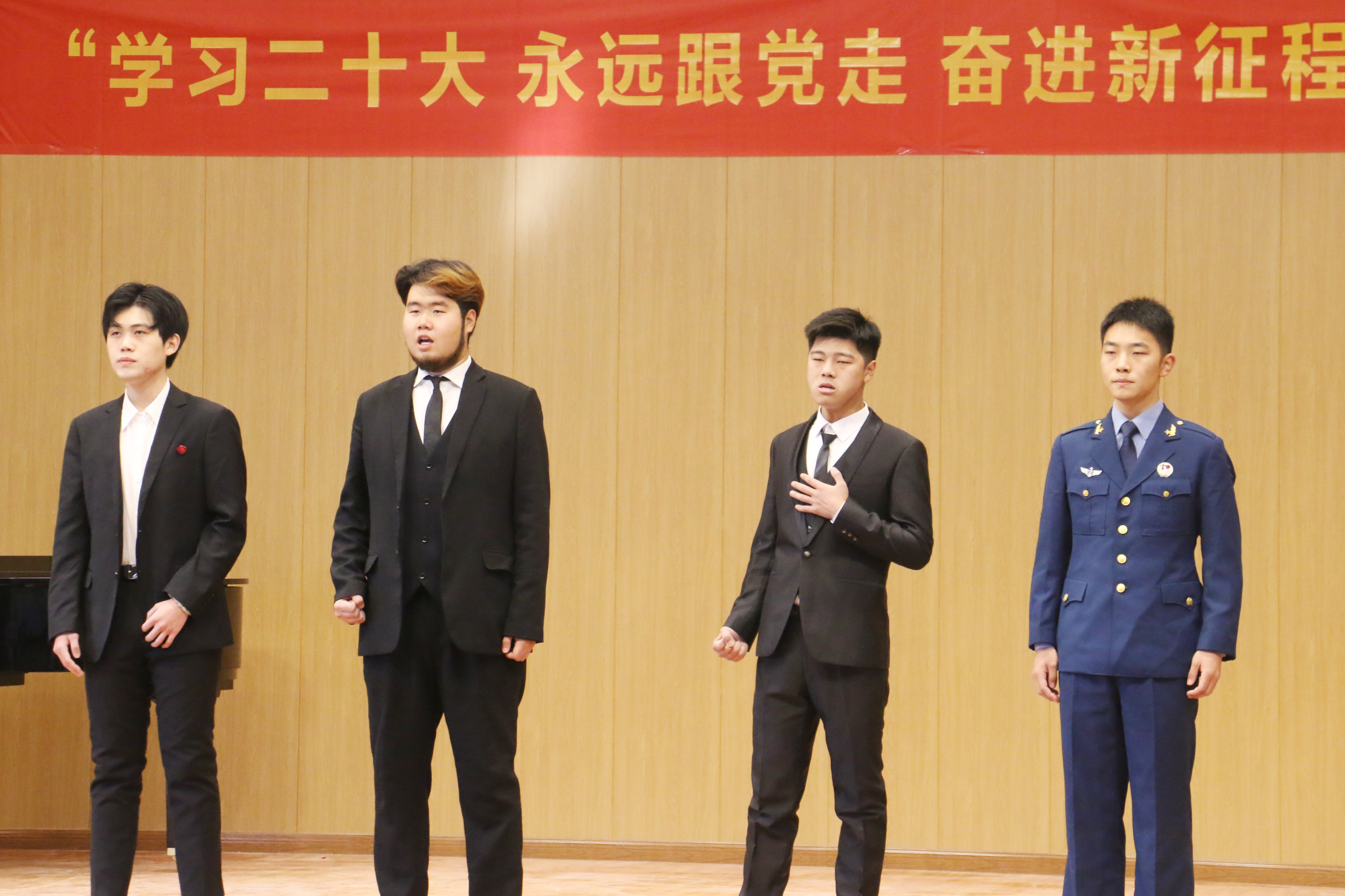 音乐会在女声合唱《三月桃花心中开》中拉开帷幕,三位同学用歌声抒发了爱党爱国的情怀。