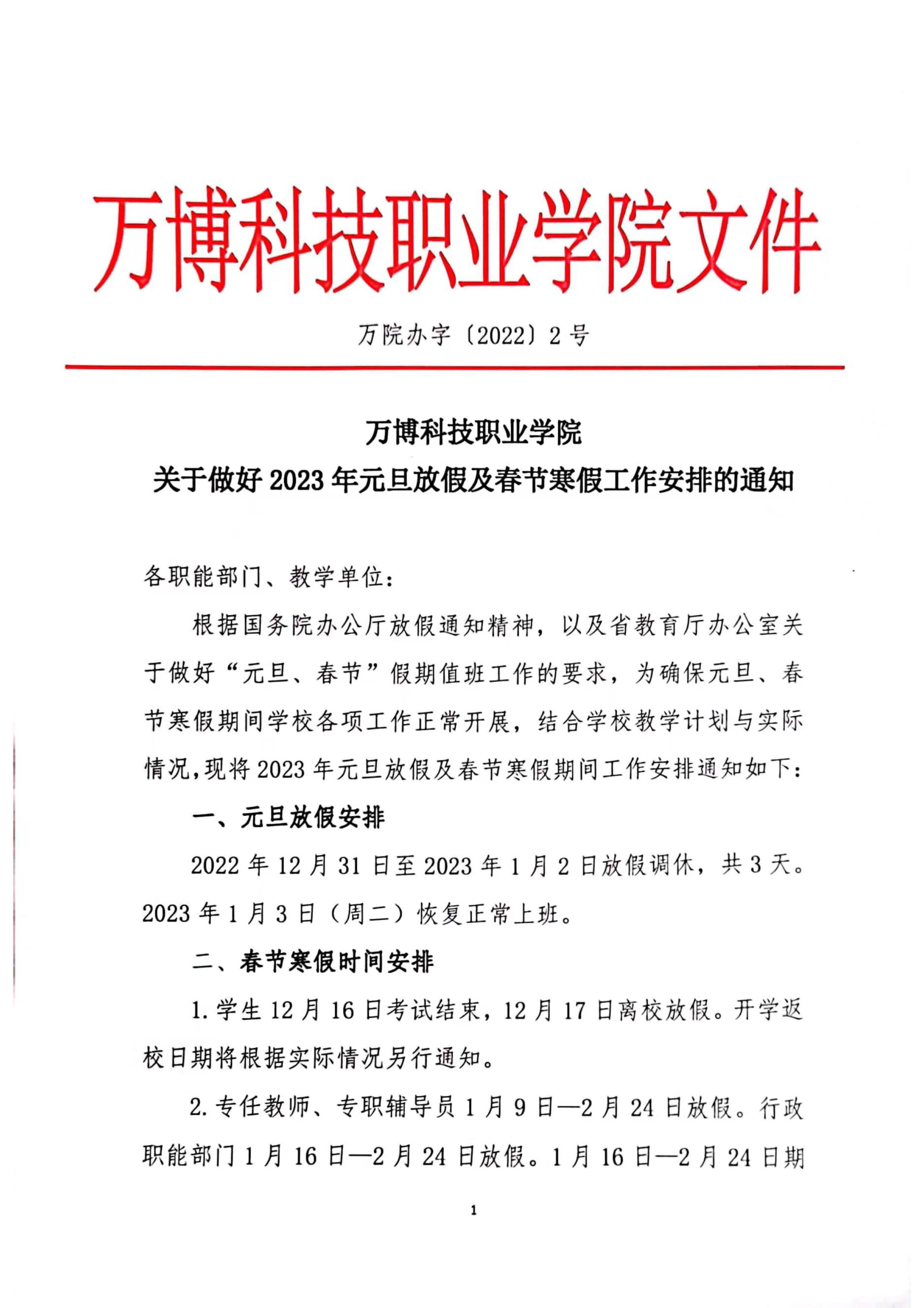 关于做好2023年元旦放假及春节寒假工作安排的通知
