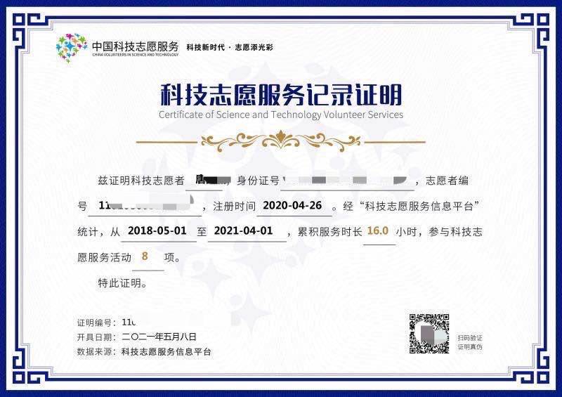 志愿者可获得中国科技志愿服务志愿者时长