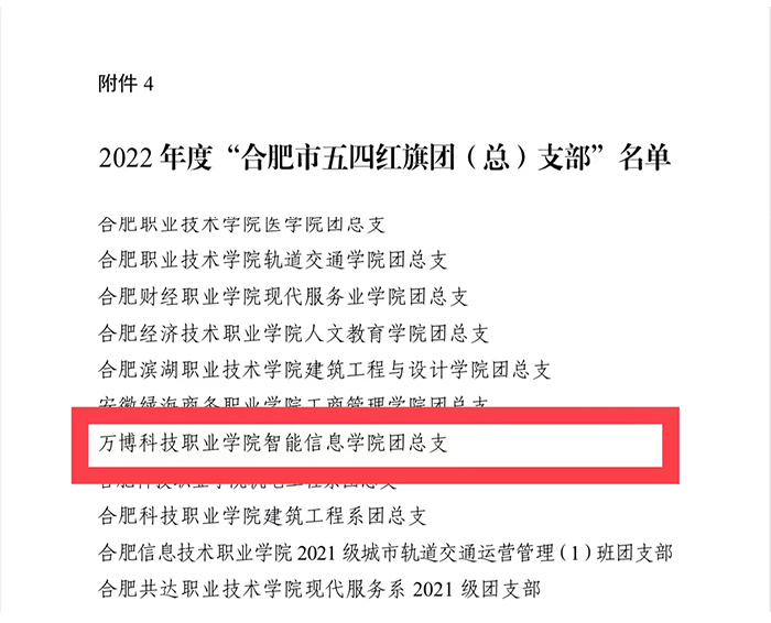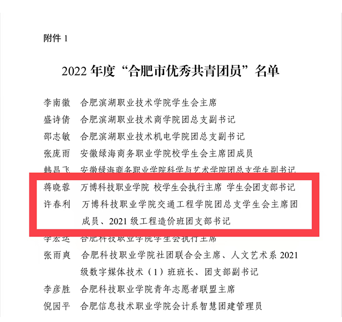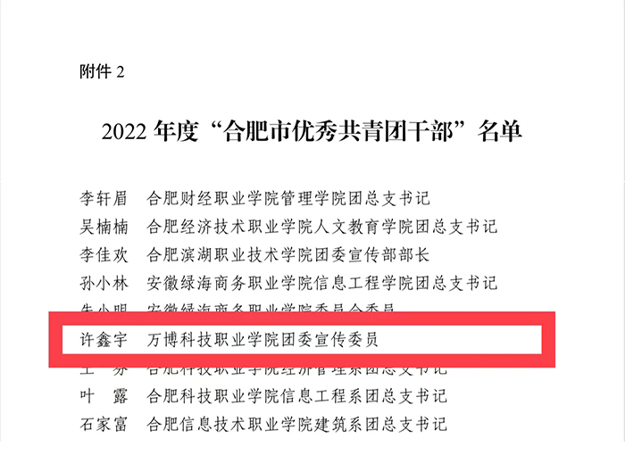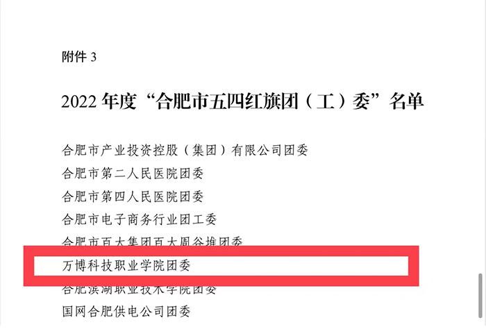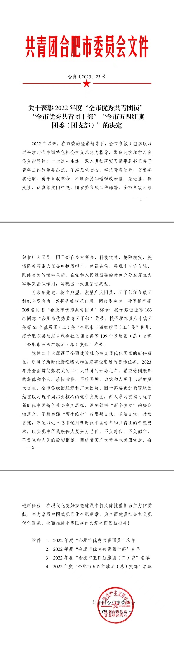 为表彰先进、树立典型,激励广大团员、团干部和全市各级团组织奋发有为,发挥先锋模范作用。5月4日,共青团合肥市委下发《关于表彰2022年度“全市优秀共青团员”“全市优秀共青团干部”“全市五四红旗团委(团支部)”的决定》,BEAT365团委荣获“合肥市五四红旗团委”称号,智能信息学院团总支荣获“合肥市五四红旗团(总)支部”称号,校团委宣传委员许鑫宇荣获“合肥市优秀共青团干部”称号,校学生会执行主席、学生会团支部书记蒋晓蓉,交通工程学院团总支学生会主席团成员、21级工程造价班团支部书记许春利荣获“合肥市优秀共青团员”称号。