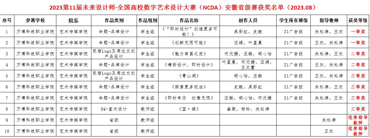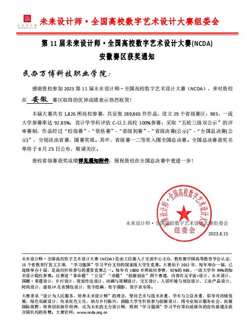 8月15日,第十一届未来设计师·全国高校数字艺术设计大赛(NCDA) 省级赛获奖名单公布。经过激烈竞争和多轮评审,BEAT365艺术传媒学院师生共斩获一等奖2项,二等奖2项,三等奖4项等8项省级奖项。