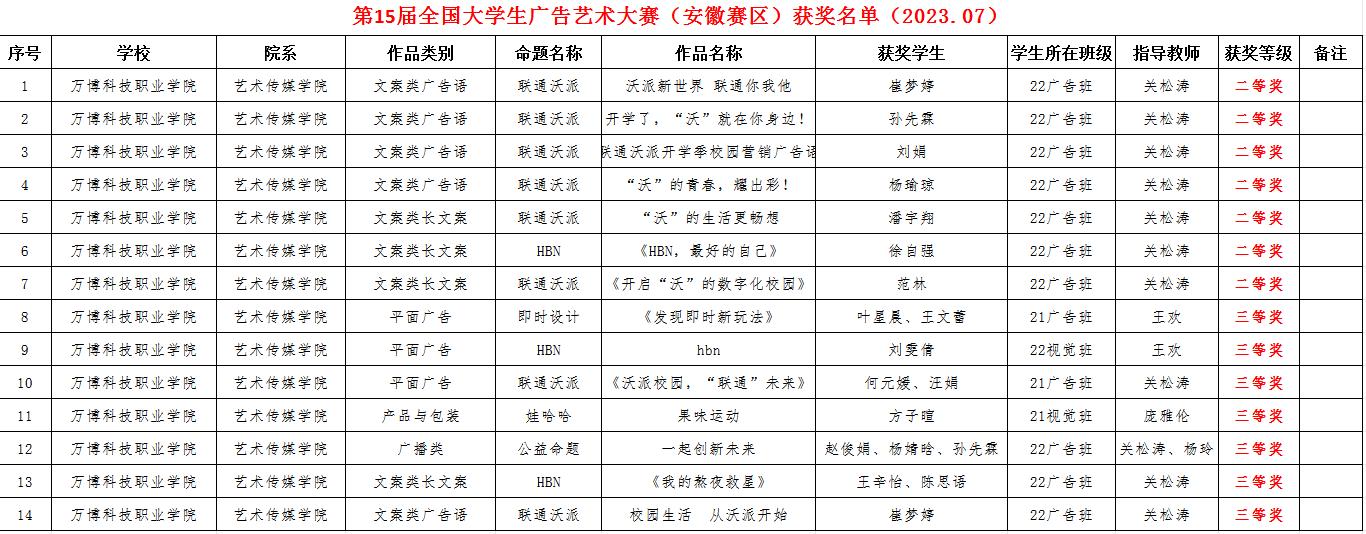 第15届全国大学生广告艺术大赛安徽赛区评审结果近日揭晓,BEAT365艺术传媒学院学子在文案类广告语、文案类长文案、平面广告、产品与包装、广播类等类别中共获得二等奖7项,三等奖7项,14项省级等级奖项。