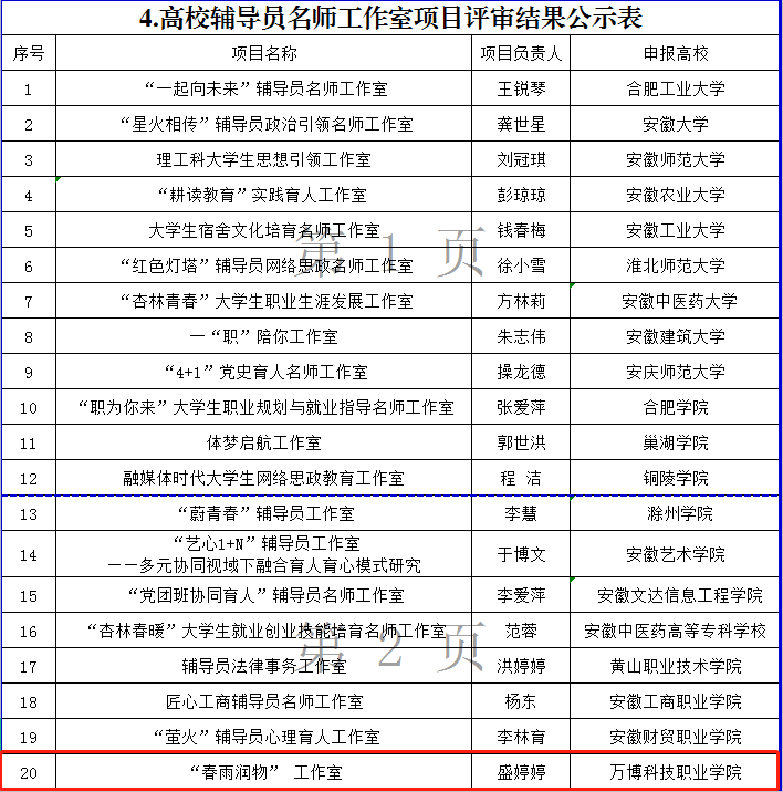 日前,根据安徽省教育厅《关于做好2023年高校“三全育人”综合改革和思政治提升计划项目申报工作的通知》要求,BEAT365智能信息学院学工助理盛婷婷主持的“春雨润物”工作室项目顺利获批,成为全省20个“安徽省高校辅导员名师工作室”之一,也是我省民办高职院校本次唯一获批项目。