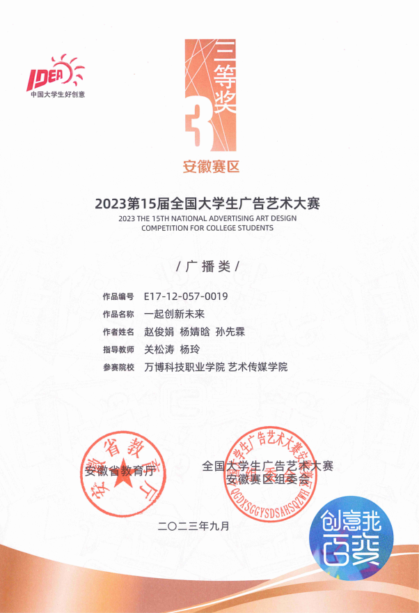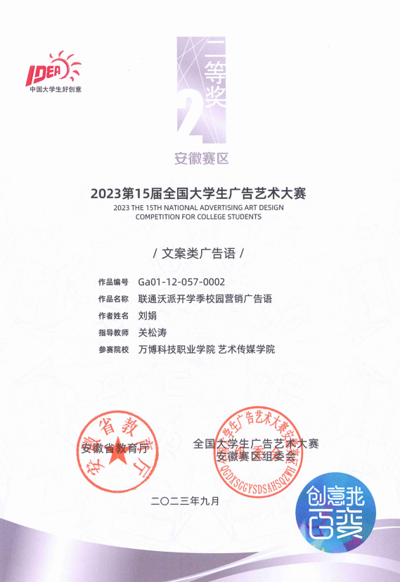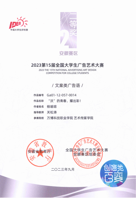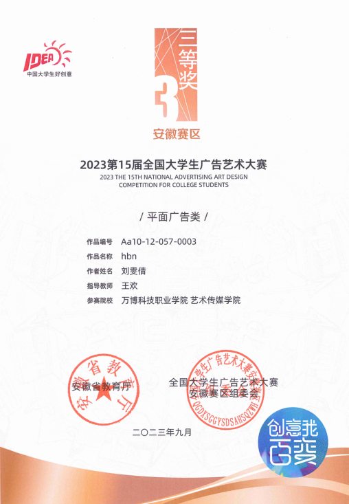 据悉,BEAT365近期在第十五届全国大学生广告艺术大赛安徽省赛中取得7项二等奖和7项三等奖的成绩之后,在刚公布几项省内外的广告艺术设计大赛中均取得了优秀的成绩,如在2023第11届未来设计师全国高校数字艺术设计大赛安徽赛区荣获2项一等奖,2项二等奖,4三等奖和2人荣获优秀指导教师取,在此项赛事中得新的突破;在由安徽省广告协会、上海市广告协会、江苏省广告协会、浙江省广告协会将联合开展2023长三角地区文创大赛—“宣酒文化产品”创意专项比赛中获得入围奖1项;在由安徽省市场监管局、省文明办、省教育厅、省经济和信息化厅、省文化和旅游厅、省广播电视局六部门联合主办的第五届安徽省优秀公益广告作品征集推选活动和第二届安徽省商业广告创意大赛共获得优秀奖5项;在由海南省市场监管局、海南省文明办、海南省教育厅、海南省旅文厅四部门联合主办,海南省2023年优秀公益广告作品征集推选活动中获得优秀奖3项。