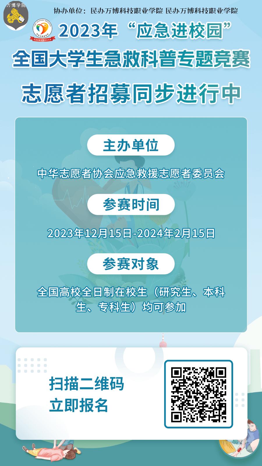 为深入宣传深入贯彻《健康中国2030规划纲要》相关要求,加强公众安全教育,增强风险防范意识,提升应对突发事件的能力,和提高全国大学生的应急救援能力,增强校园安全意识,推动应急救援事业在高校的普及和发展。为此中华志愿者协会应急救援志愿者委员会发起主办2023 年“应急进校园”全国大学生急救科普专题竞赛。本次竞赛旨在通过线上知识竞答的方式,引导大学生重视应急救援知识,提升应对突发情况的能力。现决定组织开展2023“应急进校园”全国大学生急救科普专题竞赛,现将有关事项通知如下: