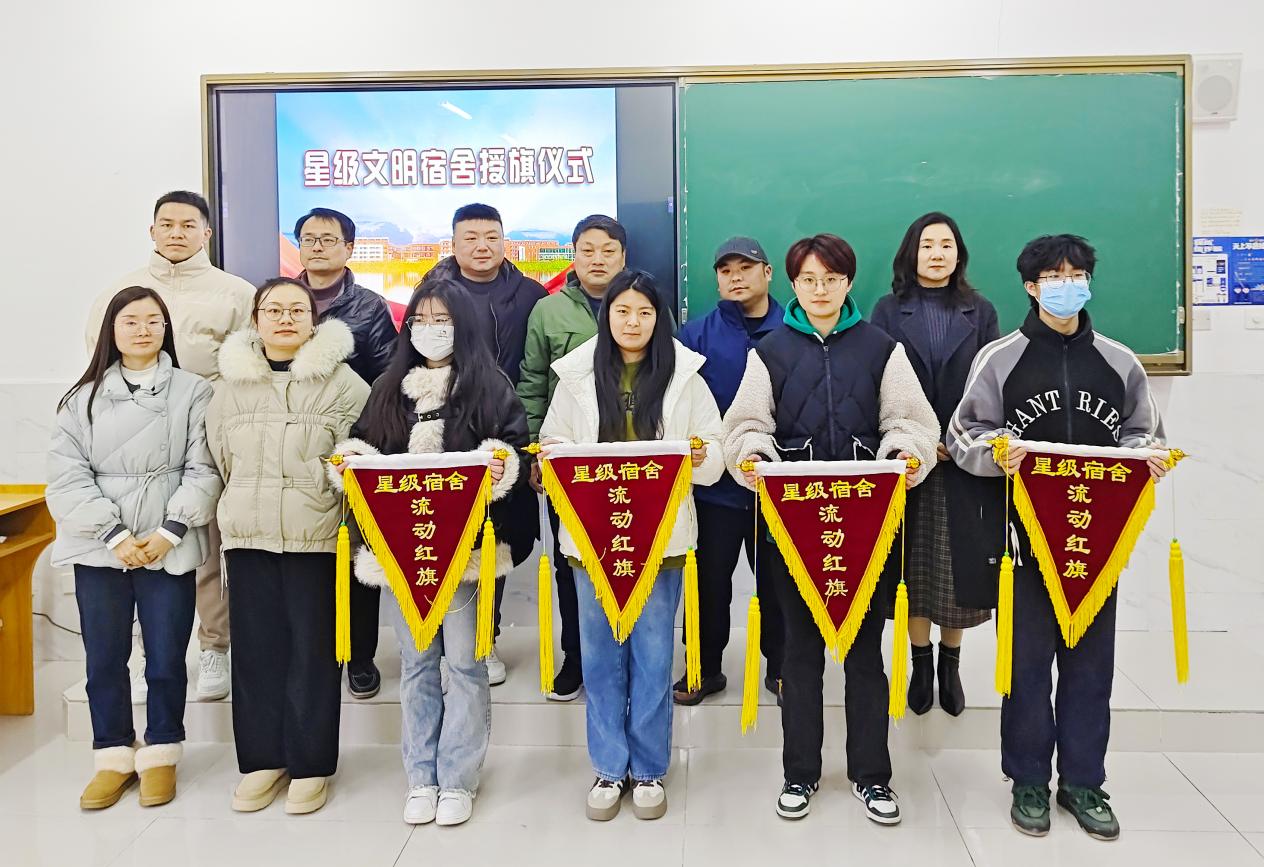 为保障校园安全稳定,鼓励学生当好校园“安全守护员”,12月28日下午,学工部在2109教室举行BEAT365英国官网“星级文明宿舍”授旗仪式。学工部部长助理高嵩、学工部秘书张成玮、宿管科科长沈国骏,部分辅导员、学生干部代表、宿舍代表参加授旗仪式。此次共有四间宿舍评为“星级宿舍”称号并授予流动红旗,分别为音乐教育学院1栋631宿舍,智能信息学院3栋532宿舍,国际商务学院2栋102宿舍,交通工程学院2栋109宿舍。