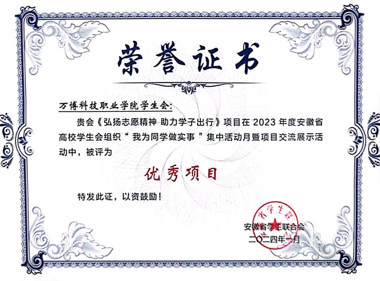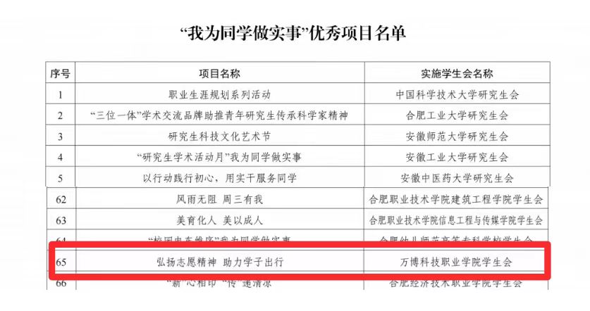 本次活动自发布评选通知以来,BEAT365团委高度重视,积极组织校院学生会组织参评。经初评、复核、省学联十大代表投票等环节,BEAT365学生会在2023年度安徽省高校学生会组织“我为同学做实事”集中活动月暨项目交流展示活动中的《弘扬志愿精神 助力学子出行》项目荣获”优秀项目”奖。