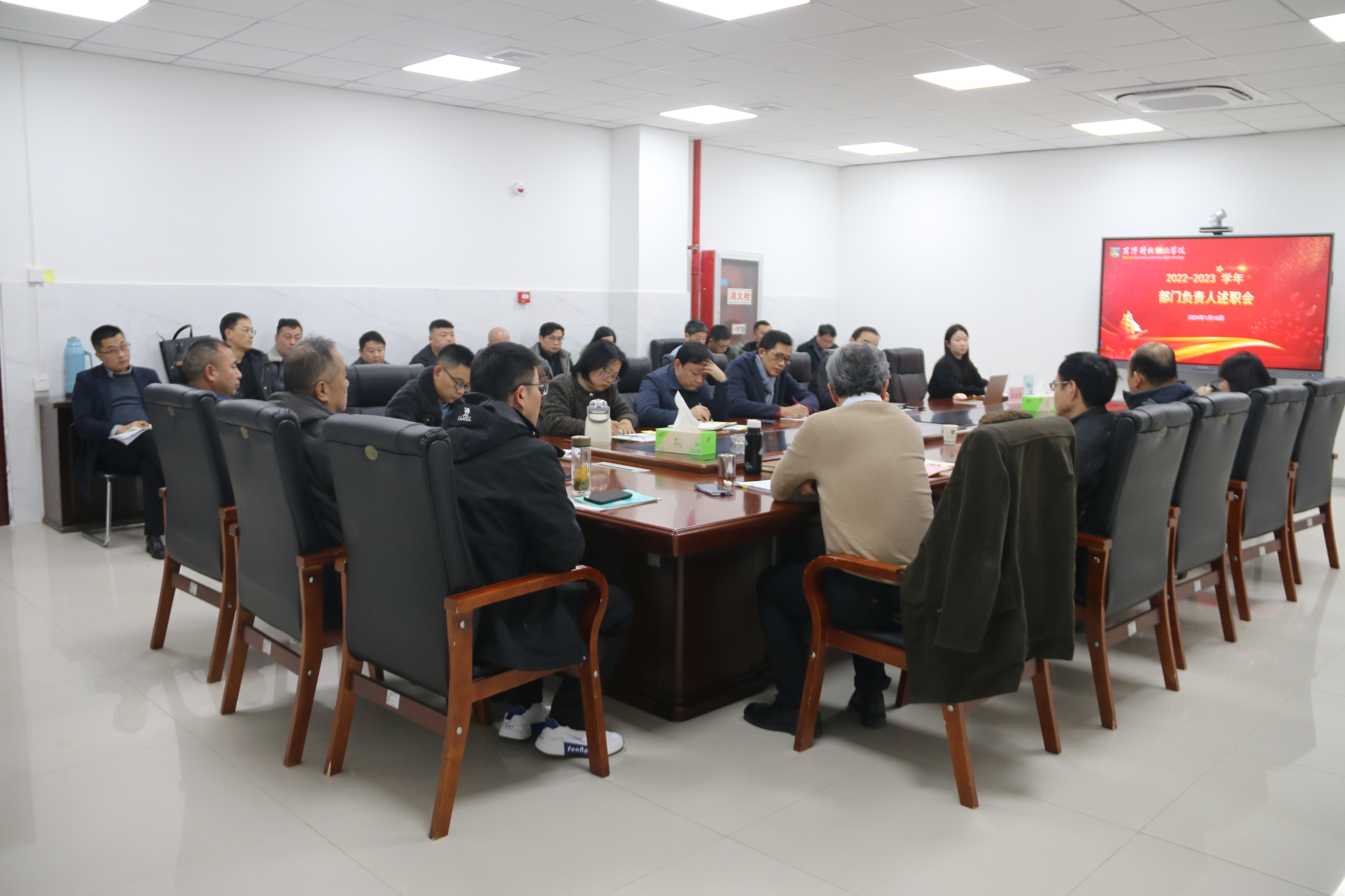 2024年1月15日上午,万博学院科技职业学院2023中层干部工作述职暨年终总结会议在图书馆三楼会议室召开。督导专员、校党委书记鲍习生,校党委副书记、执行校长张进,校党委委员、副校长马赞及其他各部门负责人参会,会议由校党委委员、副校长耿瑜主持。
