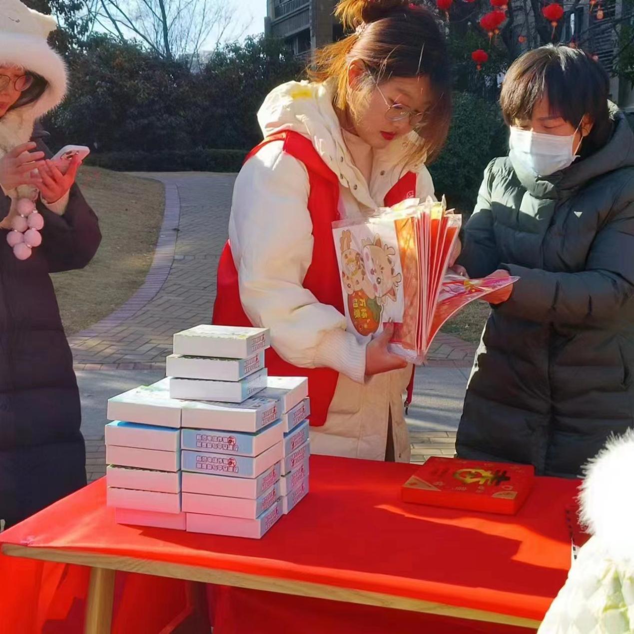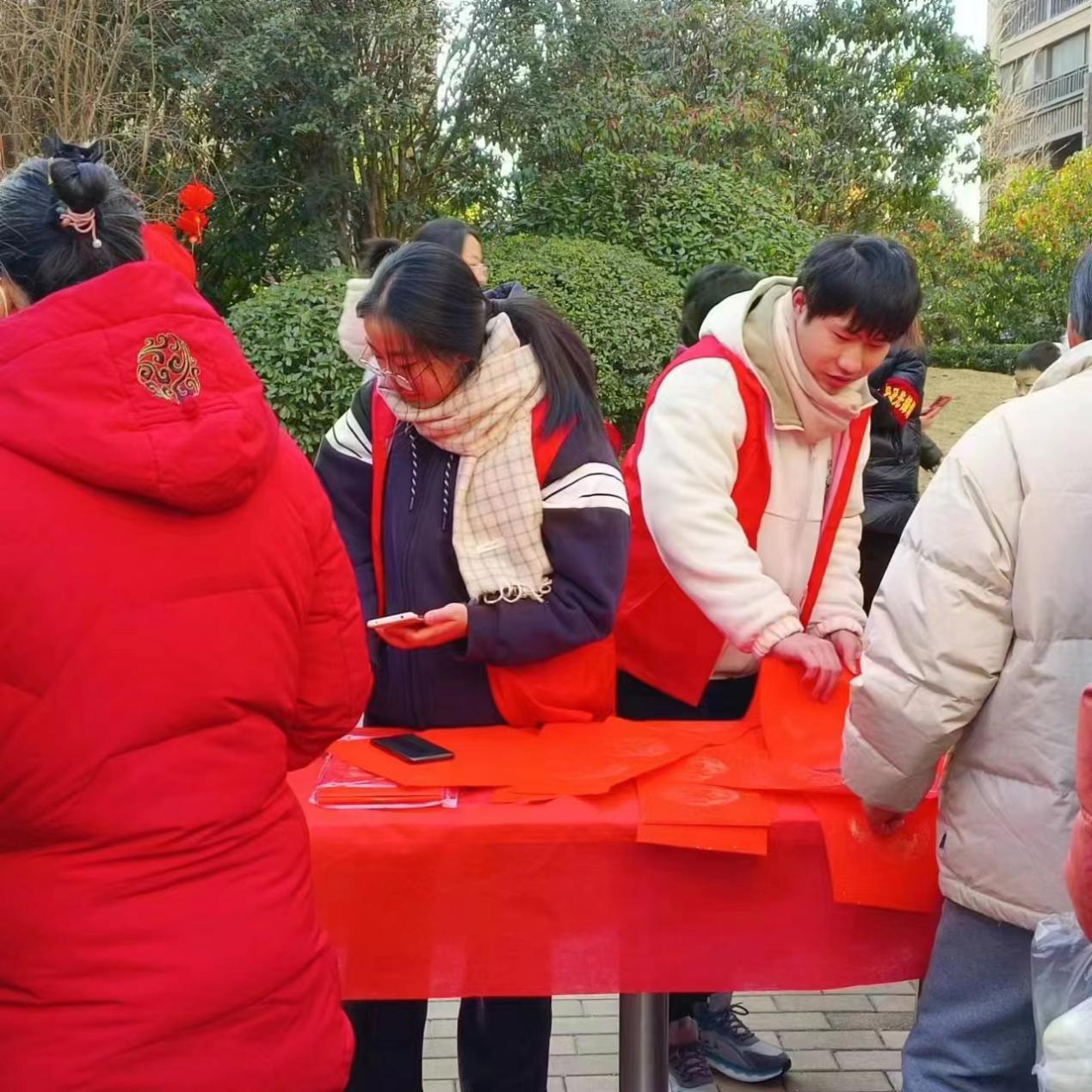当日,队员们早早来到活动现场,摆放桌椅、拉条幅、挂灯笼,营造了浓厚的春节氛围。活动伊始,队员们分工协助,有条不紊的开展工作,引导居民签到、维护表演秩序、晾晒发放春联,特别是在活动现场教小朋友们剪窗花、做灯笼,为现场增添了一抹童趣。活动即将结束,队员们为现场居民发放许愿牌,“希望爸妈新的一年身体健康”、“2024发大财”、“希望新的一年能找到另一半”……整个活动现场欢乐、祥和。
