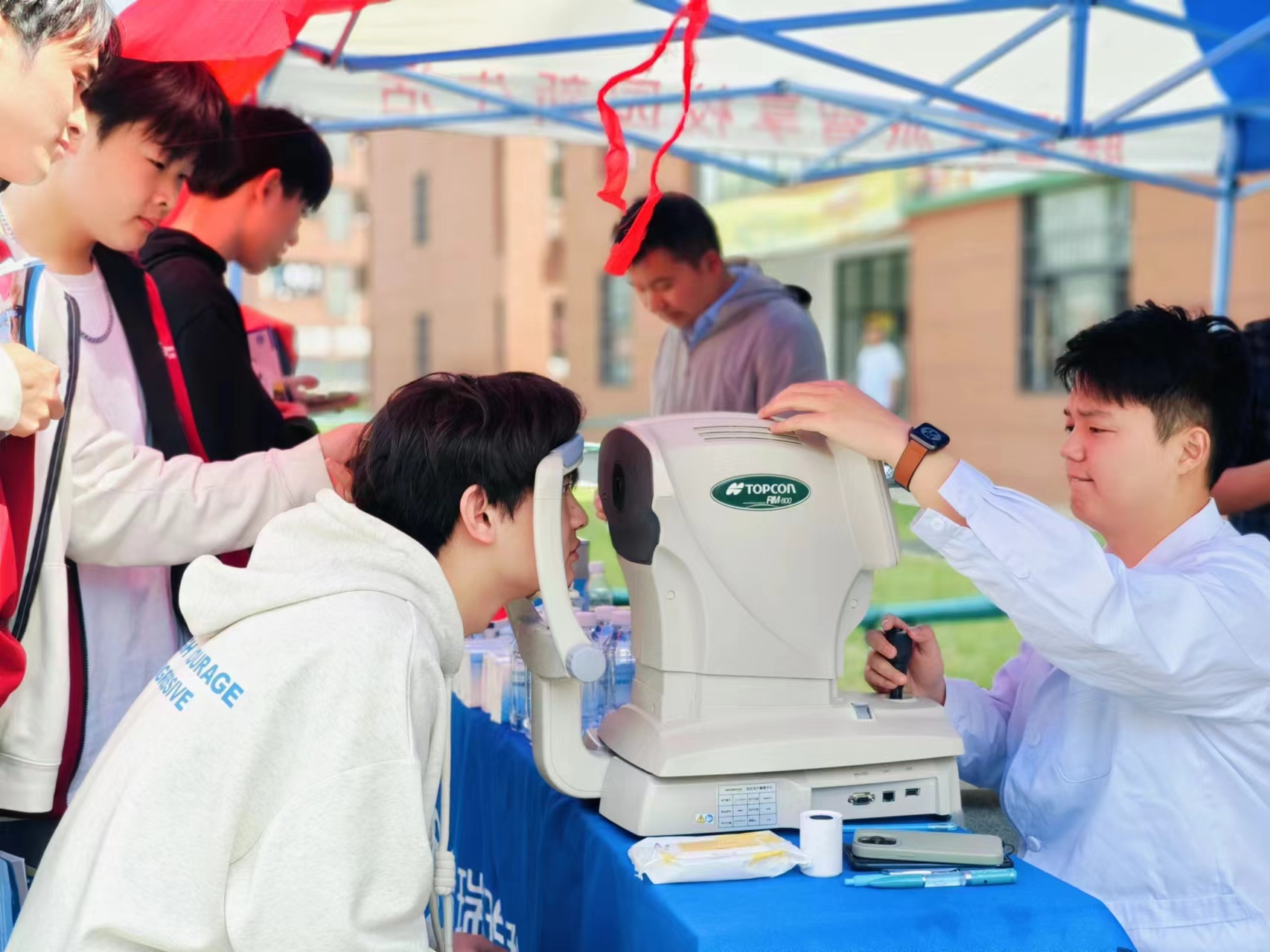 活动现场,前来检查的师生络绎不绝,志愿者引导师生有序候诊。医务人员为广大师生提供了电脑验光、眼底检查、眼镜度数检测以及眼镜清洗服务等测试项目,测量近视、散光、角膜曲率、瞳距等数据,在数据测量后分析个人视力状况,给予专业的护理建议和护眼知识,并提供下一步注意事项的科学建议,引导同学们关注眼睛健康,学会科学爱眼护眼。