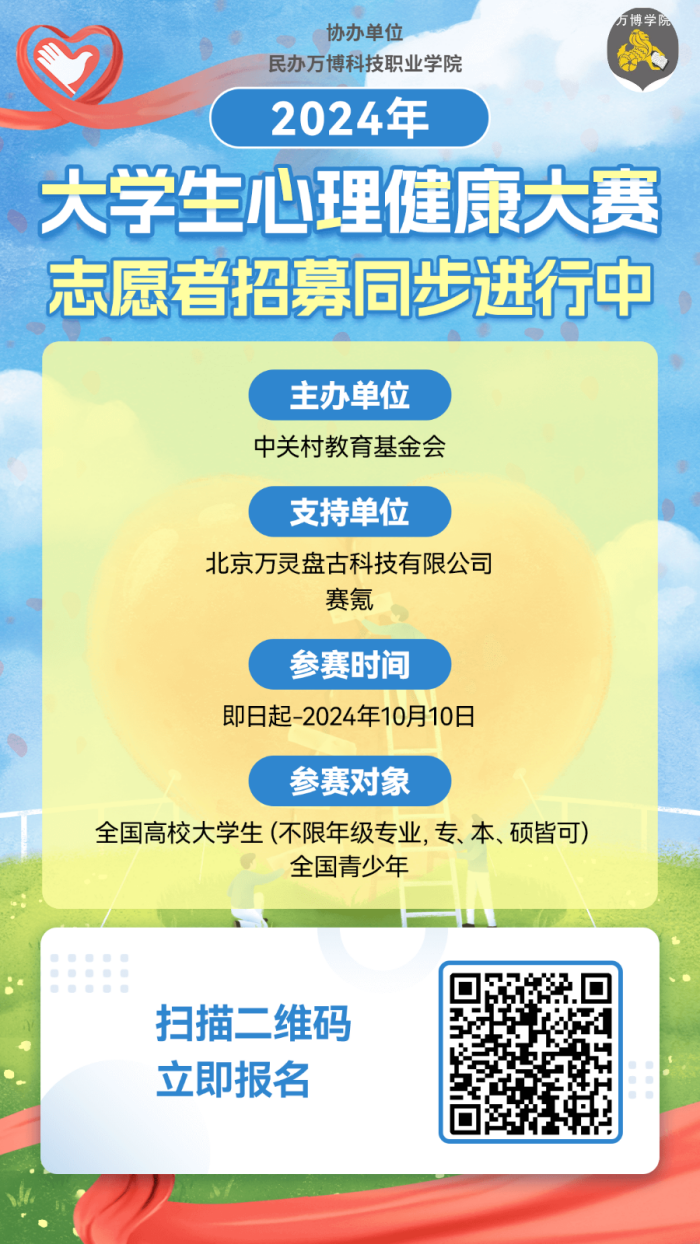为深入学习贯彻习近平新时代中国特色社会主义思想,落实关于实施创新驱动发展战略、深化高等学校创新创业教育改革决策部署、助力健康中国2030、社会心理服务体系建设,培养大学生科学精神、人文素养和社会责任感,引导大学生学习掌握心理健康知识并学以致用,中关村教育基金会拟举办“2024年大学生心理健康大赛”,欢迎BEAT365在校学生踊跃报名参赛。
