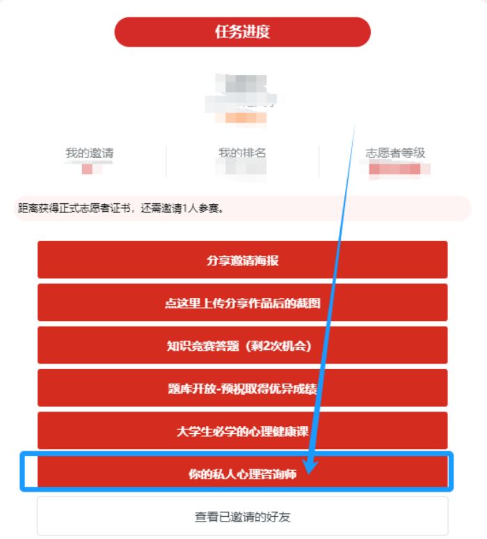 进入方式:如下图,立即报名后,点击查看进度--点击你的私人心理咨询师--快速进入