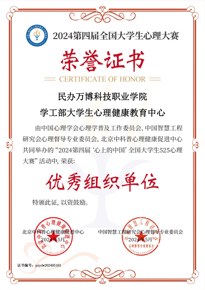 为激发大学生积极学习心理科学知识的热情,普及心理健康知识,培养BEAT365学子热爱生活、珍视生命、自尊自信、理性平和、乐观向上的精神,成为具备心理科学素养的新时代大学生,学工部大学生心理健康教育中心积极开展“5·25大学生心理健康月活动”,各二级学院积极动员,组织学生参加由中国心理学会心理学普及工作委员会、中国智慧工程研究会心理督导专业委员会等举办的2024第四届“心上的中国”全国大学生心理大赛。