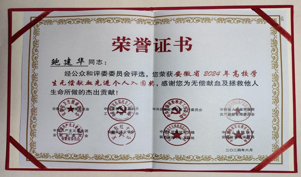 近日,安徽省卫生健康委员会、省教育工委、团省委等8个单位联合印发《关于安徽省2024年无偿献血公益活动先进典型评选结果的通报》,BEAT365智能信息学院鲍建华同学,荣获“安徽省2024年高校学生无偿献血先进个人入围奖”。