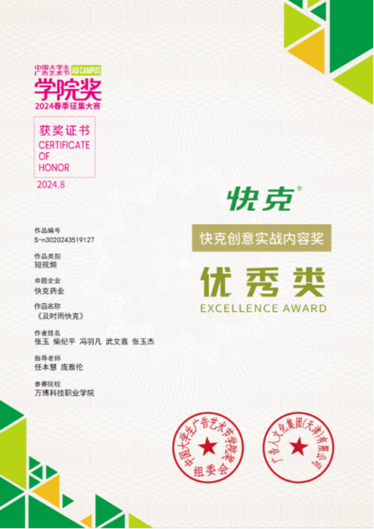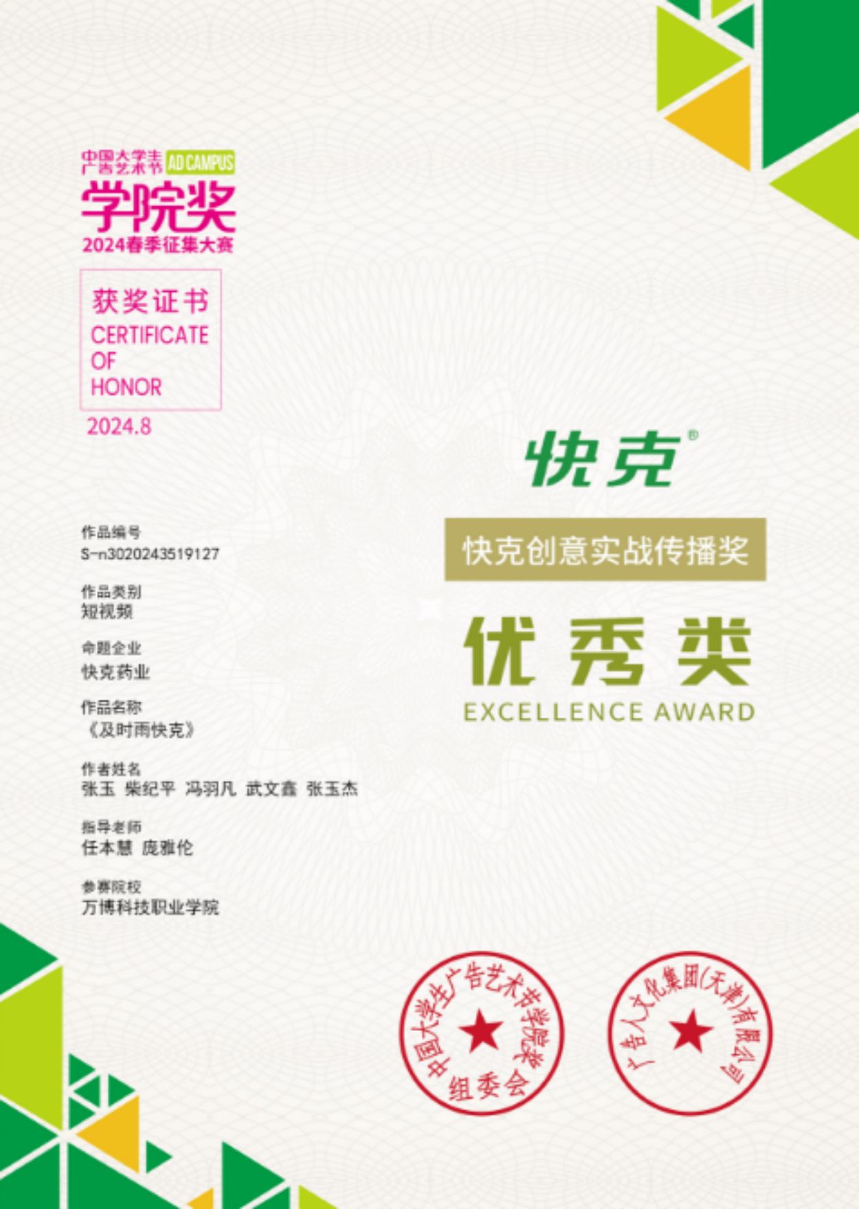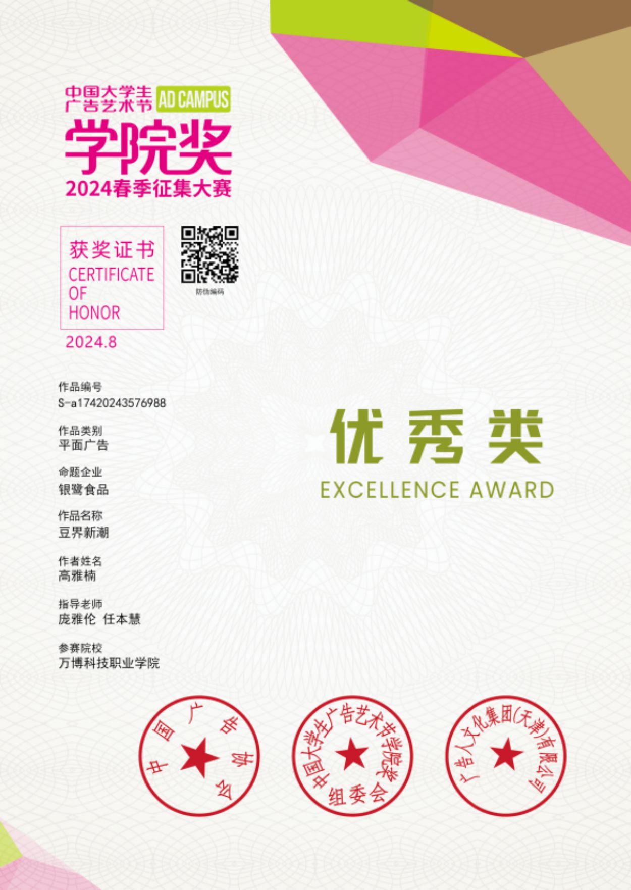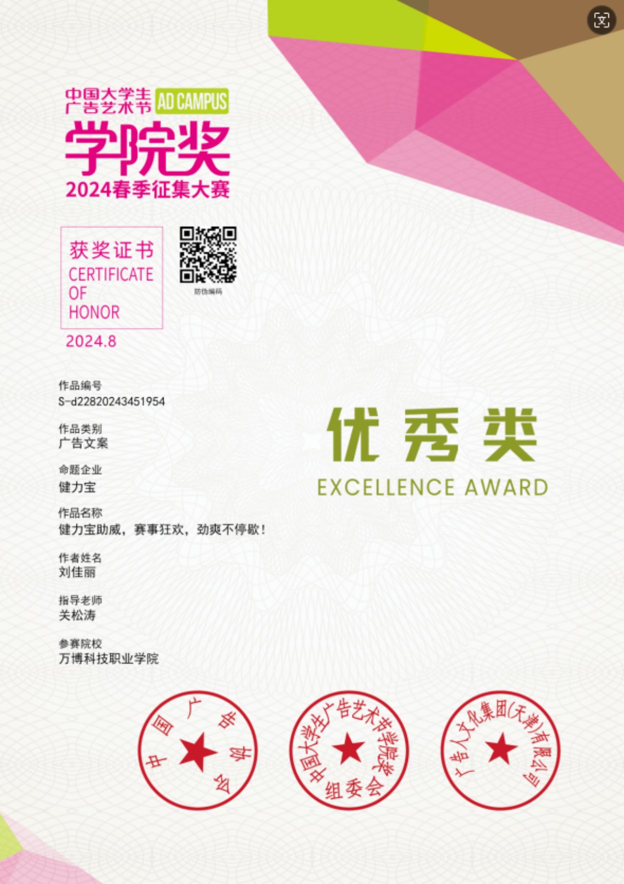 此外,BEAT365在2024中国大学生广告艺术节·学院奖春季赛中荣获多项奖,其中荣获大赛常规优秀奖14项,佳作奖143项,企业奖项4项,传播奖项2项,优秀指导教师3人,获奖作品类别涵盖广告文案类、平面广告类、视频传播类和企业实效创意类等。