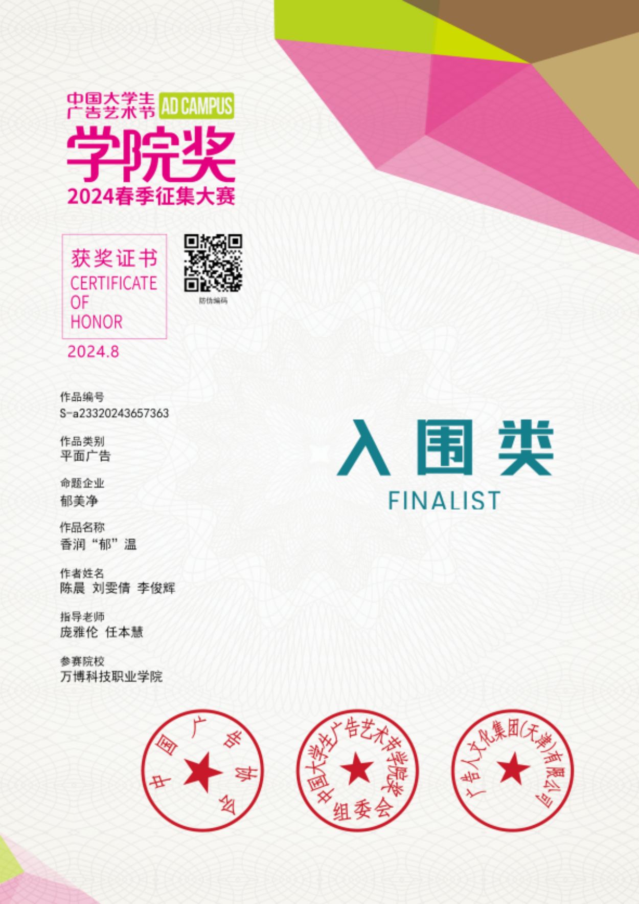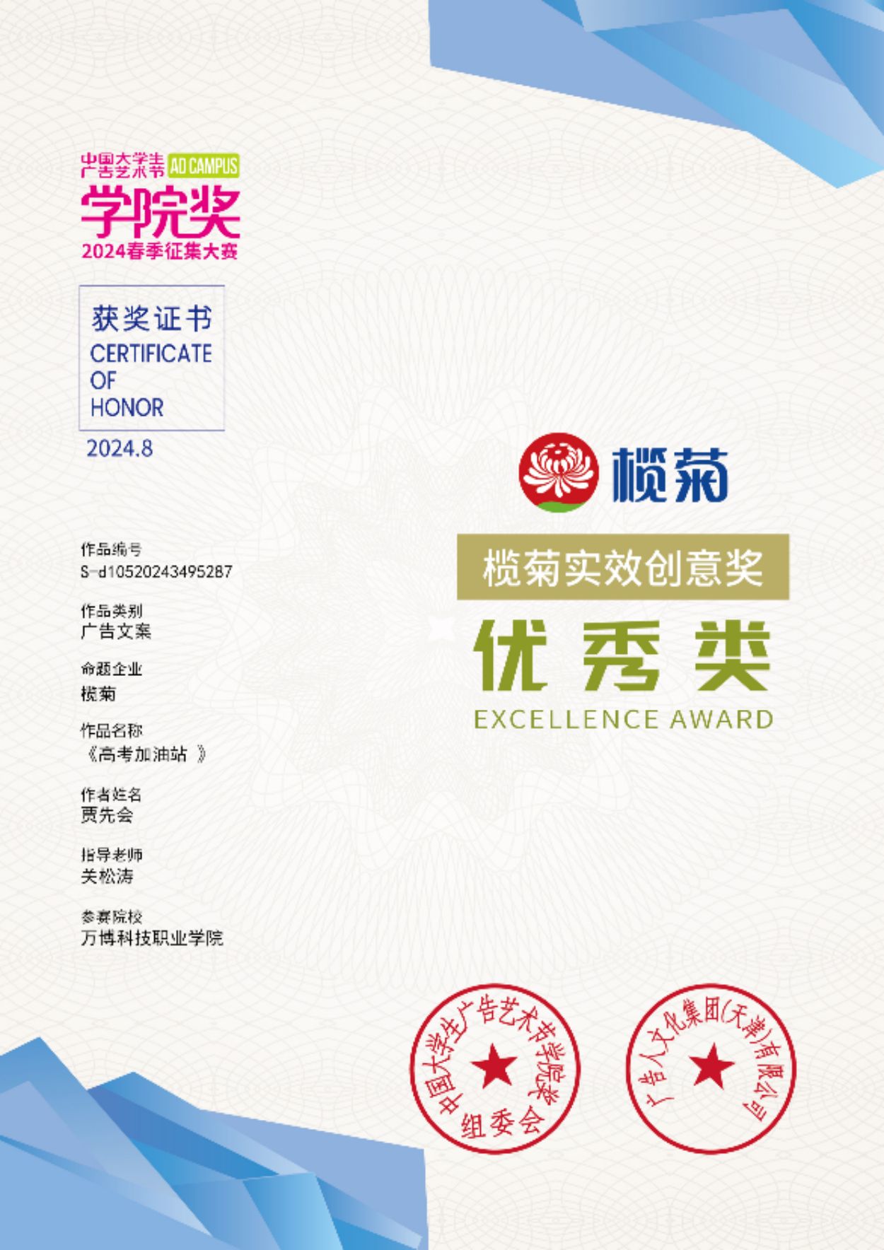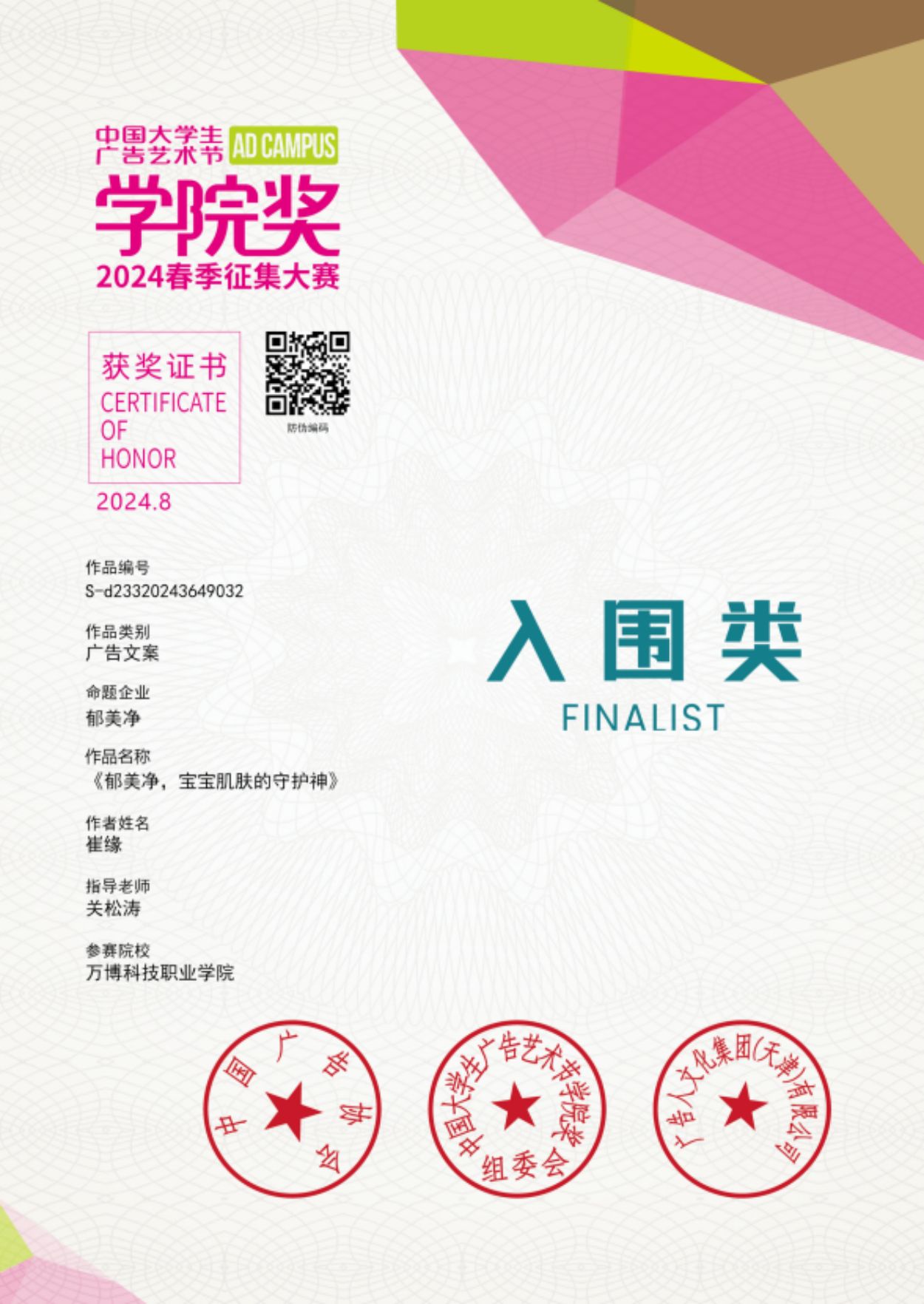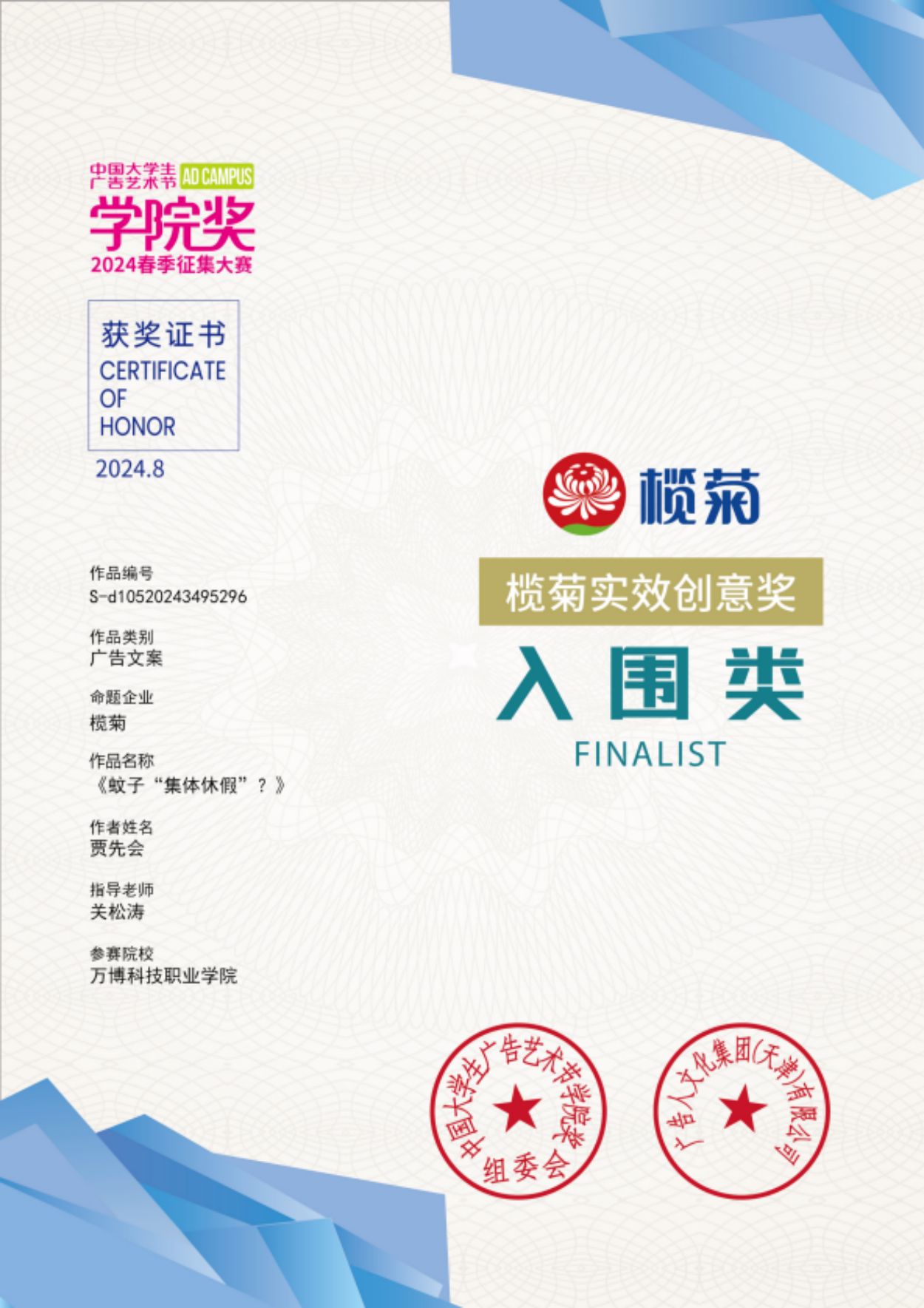 此外,BEAT365在2024中国大学生广告艺术节·学院奖春季赛中荣获多项奖,其中荣获大赛常规优秀奖14项,佳作奖143项,企业奖项4项,传播奖项2项,优秀指导教师3人,获奖作品类别涵盖广告文案类、平面广告类、视频传播类和企业实效创意类等。