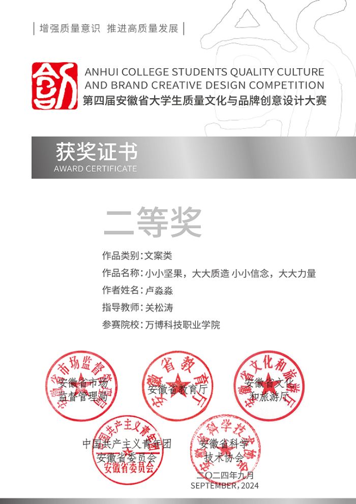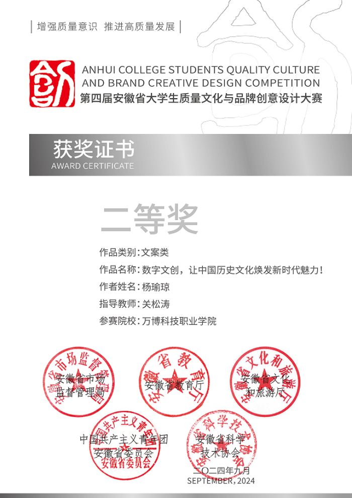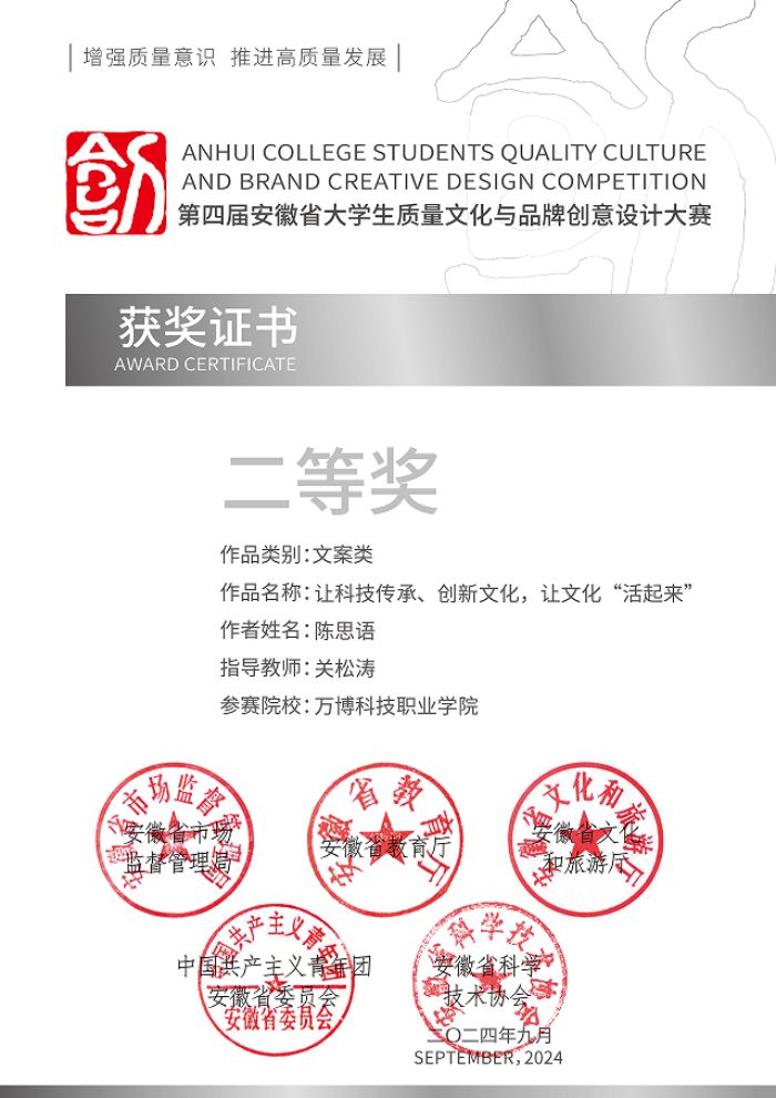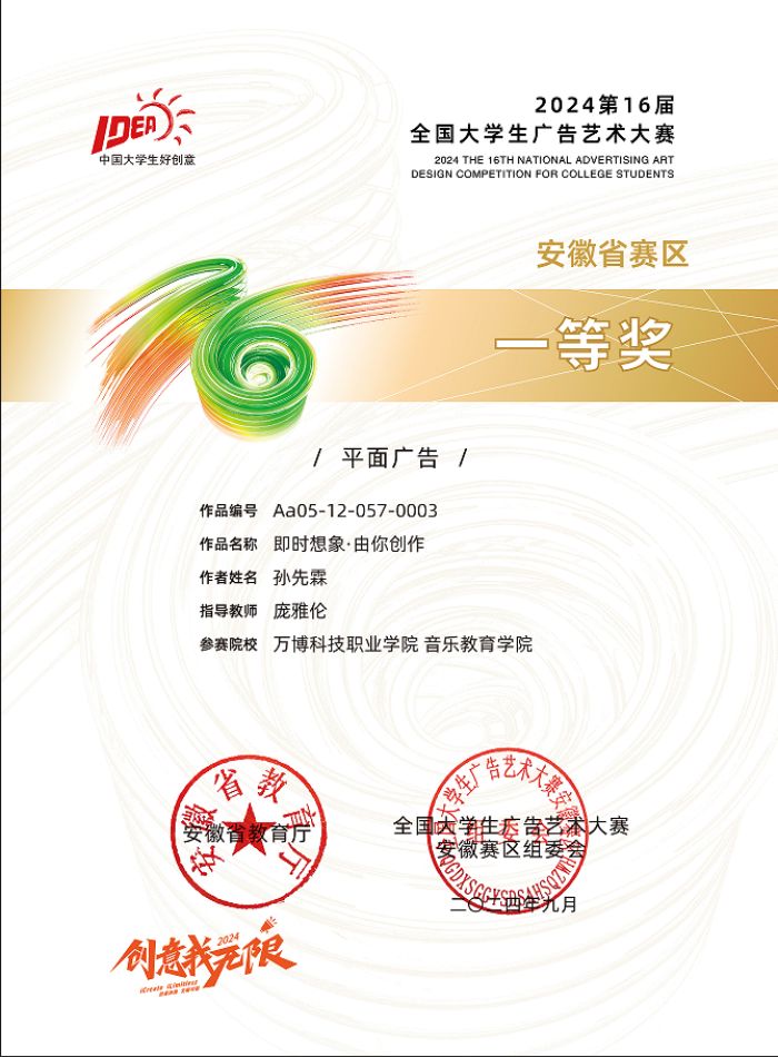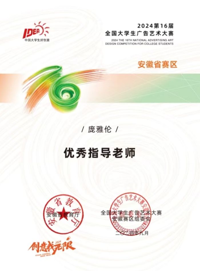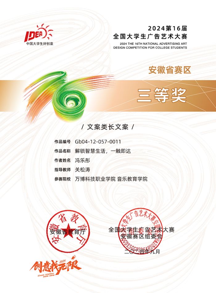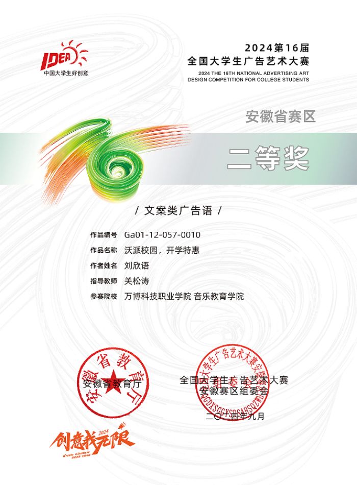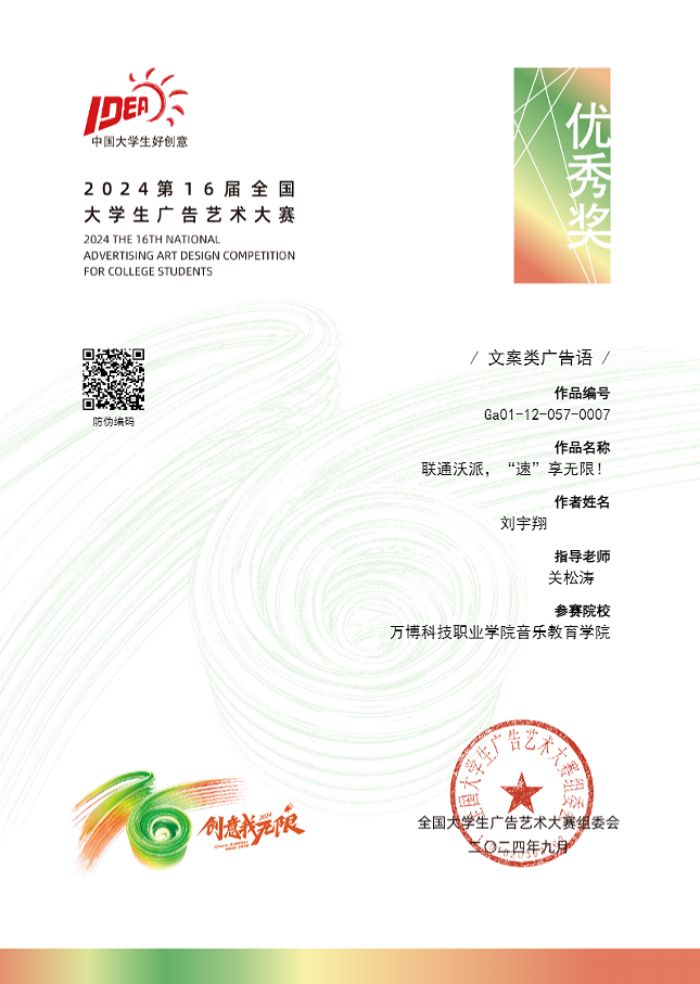 金秋韵致,桂香满园。在这个收获的季节,BEAT365师生在多项学科竞赛活动中再传捷报。在第16届全国大学生广告艺术大赛(A类赛事)总评审中,23广告班刘宇翔同学创作的广告语《联通沃派,“速”享无限》获得国赛优秀奖。今年以来,BEAT365师生在第16届全国大学生广告艺术大赛安徽省级赛、第四届安徽省质量品牌文化创意大赛、2024年中国大学生计算机设计大赛安徽省级赛等其他B类学科竞赛中获得省级等级60余项。