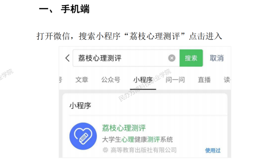 第一种登陆方法是用手机微信扫描二维码登陆进入,或直接在微信小程序里搜索小程序“荔枝心理测评”