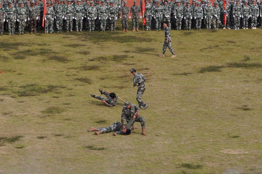 在激昂雄壮的国歌声中,军训会演正式拉开帷幕。新生组成的21个方队,迈着整齐的步伐依次入场。分列式中,同学们口号响亮,身姿挺拔,步伐铿锵。随后,新生们展示了拳术表演、战术表演。他们动作标准,一气呵成,向人们展示了青春向上、斗志昂扬的精神风貌。