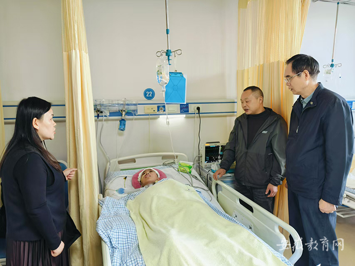 10月23日上午,院党委书记鲍习生、院团委书记王媛媛等教师、学生代表前往医院,慰问陈燕同学及其家属并转交善款。鲍习生鼓励家属努力救助伤者,同时表示学院会及时关注陈燕同学的治疗进展,为其早日重返校园提供力所能及的帮助。(特约通讯员:吴琼)