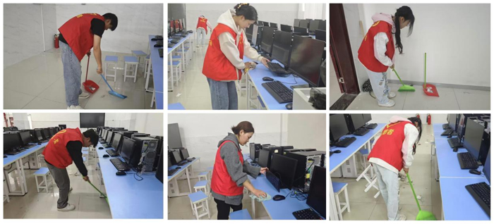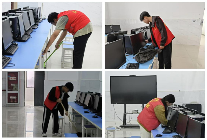 在机房里,志愿者们小心翼翼地擦拭着电脑显示屏、主机和键盘,确保每一台设备都一尘不染。他们还认真清扫了机房的地面和角落,将隐藏在桌椅下、墙角边的垃圾清理干净。在教室里,志愿者们则重点对黑板、讲台和课桌椅进行了清洁。有的同学用抹布仔细擦拭黑板,有的同学将课桌椅摆放整齐,还有的同学在扫地、拖地,不放过任何一处卫生死角。经过大家的共同努力,机房和教室焕然一新,为同学们创造了更加优质的学习环境。