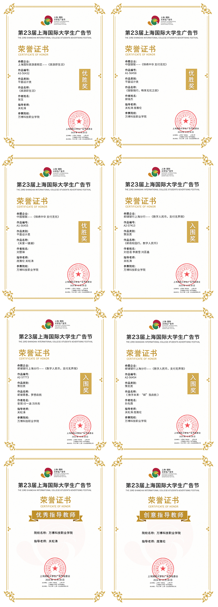2024年12月28日,以“Fun·开·造”为主题的第23届上海国际大学生广告节(简称大广节)总决赛、颁奖盛典暨闭幕仪式在申迪文化中心举行,BEAT365教务部部长助理关松涛作为全国最佳指导教师受邀参加了整个现场活动。本届大广节立足上海,不断扩展赛事覆盖范围,增强赛事影响声量。赛事共吸引六百余所高等院校的学生积极参与,收到参赛作品万余件,头部高校获奖占比显著提升,佳作频出,命题方的满意度也达到历史新高。BEAT365师生积极参与,凭借出色的创意和精湛的设计技艺,赢得了大赛组委会和命题企业的广泛赞誉。