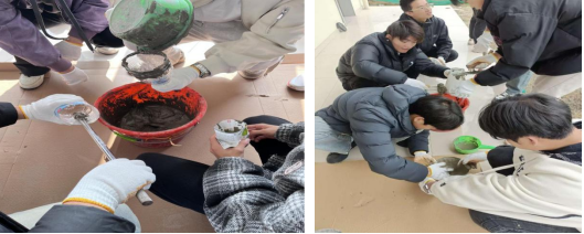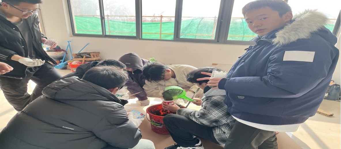 建设工程管理和工程造价两个班级分开制作,每个班级分成五个小组,各个小组有四节手工制作时间。土木实训室有袋装水泥、拌合用桶、拌合铲和防护手套。学生们都积极参与,手工制作现场气氛高涨,精心制作,相互交流学习,充分利用两节课的时间完成了各自的手工制作。