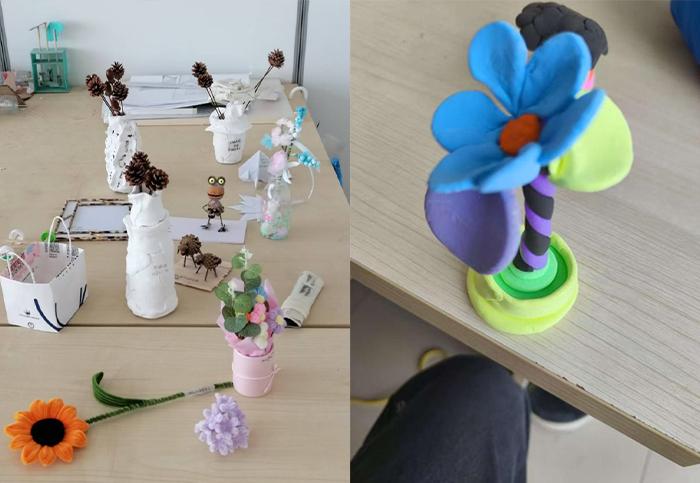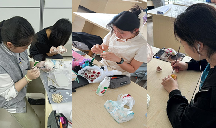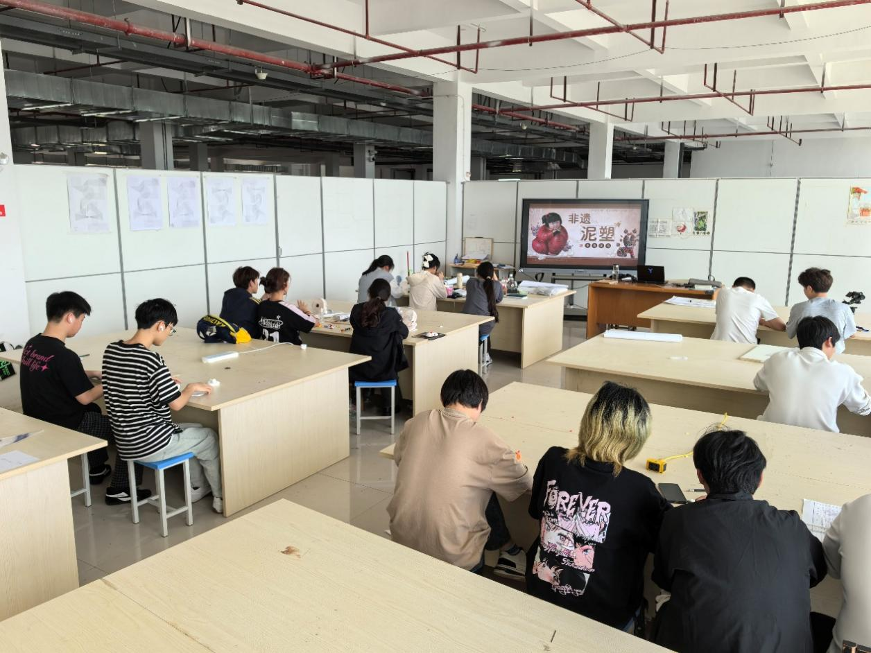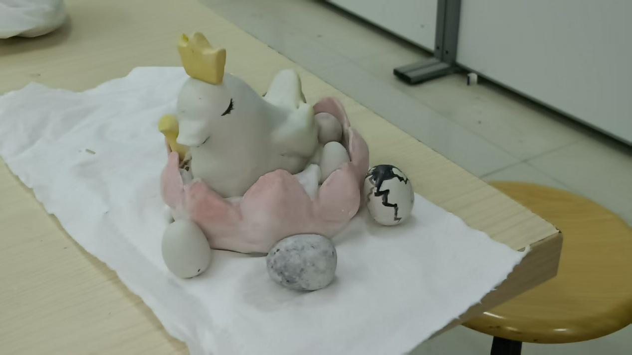 与旧物改造形成呼应的是“非遗泥塑”实践环节。泥塑作为国家级非物质文化遗产,拥有悠久的历史与丰富的表现形式。指导教师现场授课,向学生详细讲授泥塑的历史起源、技艺流程、造型语言及文化寓意。在老师的演示下,学生们学习了基本的捏制技巧,如搓条、压塑、拼接、刻花等传统工艺。在初步掌握造型手法后,学生被分组进行创作,围绕“传统文化”“绿色生活”“空间意象”三大主题,展开自由表达。