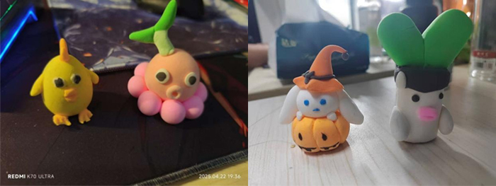 学生们的作品充分体现出对非遗泥塑的理解与创新:有的以“祥兽瑞禽”为题材,塑造吉祥寓意的传统形象;有的将当代流行元素融入传统技法,创造出融合漫画风格与传统造型的趣味作品;更有学生尝试将泥塑小件设计为室内软装装饰模型,拓展了非遗技艺在现代设计语境中的应用边界。