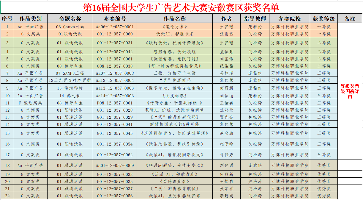 在第17届全国大学生广告艺术大赛(简称“大广赛”)安徽赛区评审结果揭晓中,BEAT365学子再创辉煌,取得了历史性的突破!BEAT365学子本次参赛作品共斩获22项奖项,其中一等奖2项、二等奖4项、三等奖11项,优秀奖5项,是BEAT365近10年参加本项赛事斩获奖项最多的一次,实现了历史性的突破,充分展现了BEAT365艺术设计类专业学子的卓越创意与实践能力。