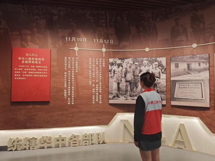 新四军江北指挥部纪念馆承载着抗战时期新四军在江北地区浴血奋战的光辉历史。在庄严肃穆的馆内,实践队员们怀着崇敬之情,依次参观各个展厅。一幅幅珍贵的历史照片、一件件斑驳的革命文物、一段段详实的文献记载,生动再现了新四军将士们不畏强敌、保家卫国的英勇事迹。队员们驻足凝视,认真聆听讲解,深入了解了新四军江北指挥部成立的背景、发展历程及在抗战中的关键作用,深刻体悟革命先辈坚定的理想信念和无私奉献精神。