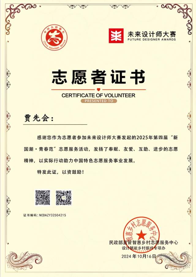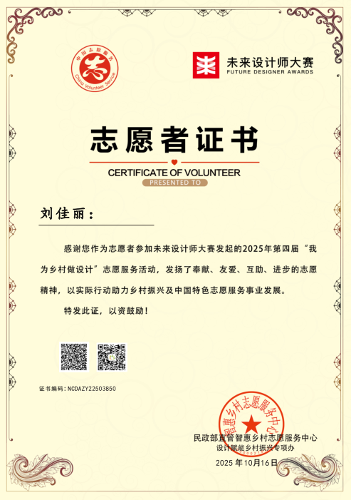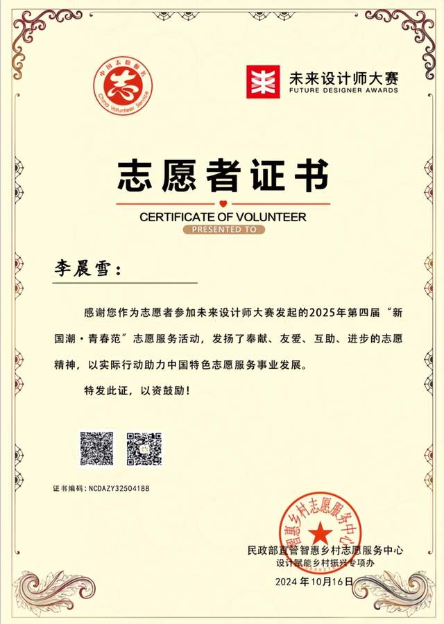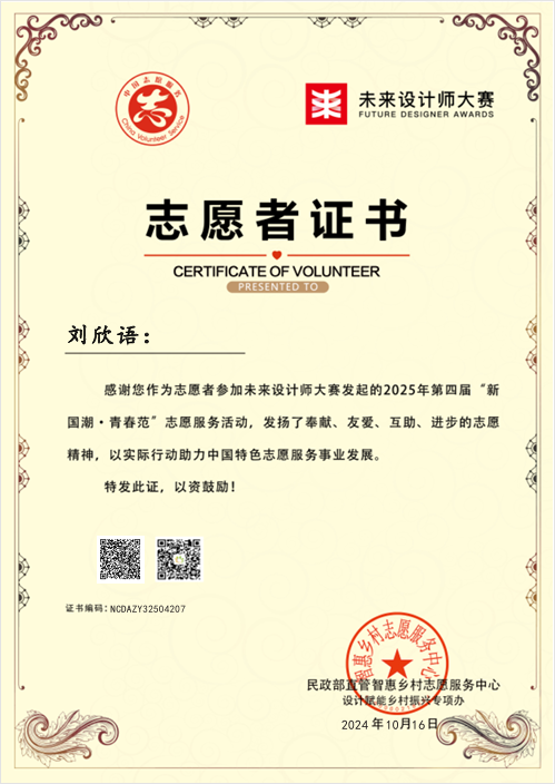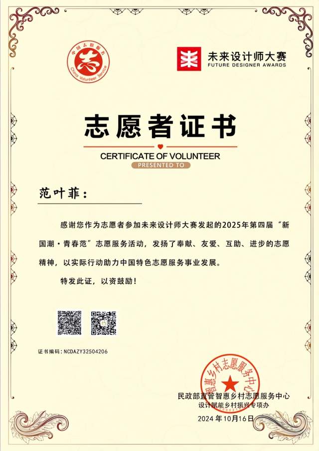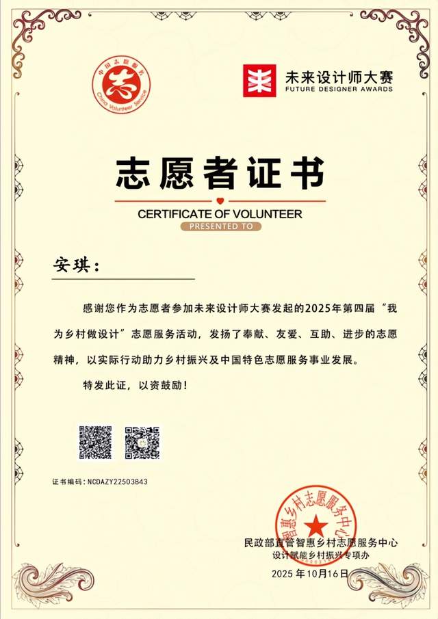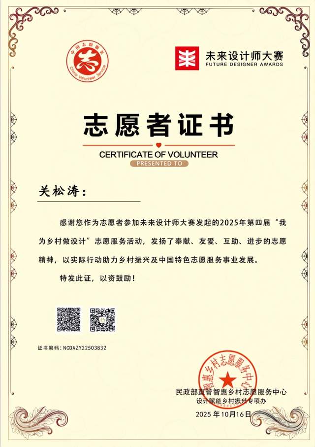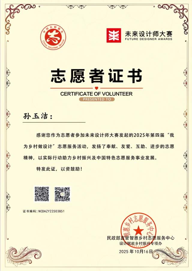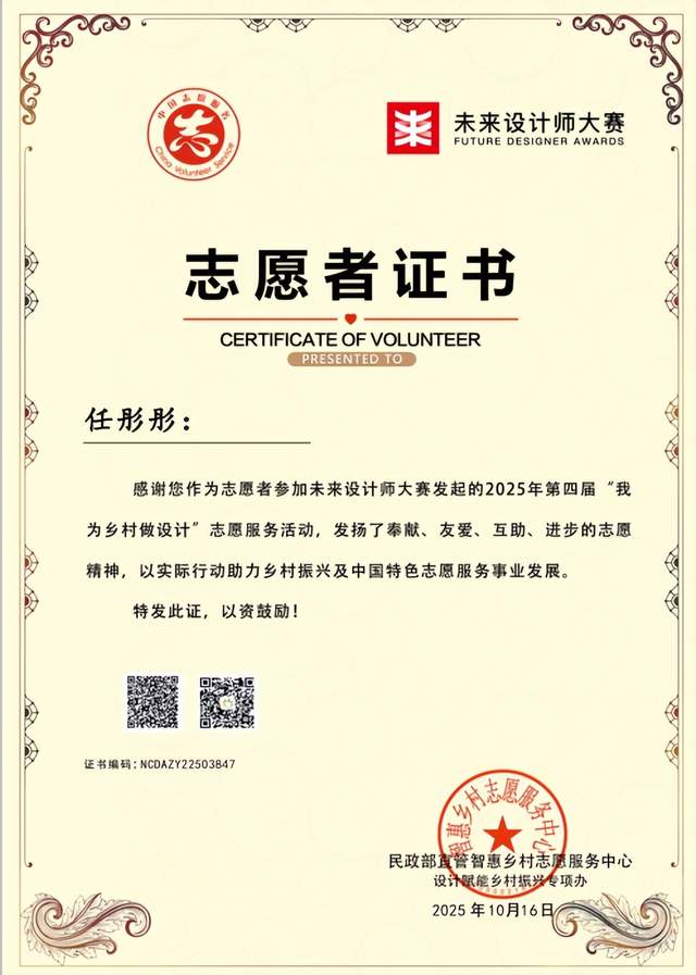 近日,由民政部智惠乡村志愿服务中心与2025第13届未来设计师·全国高校数字艺术设计大赛组委会联合发起的第四届“我为乡村做设计”和“新国潮·青春范”志愿服务活动圆满结束。为弘扬“奉献、友爱、互助、进步”的志愿精神,表彰在活动中表现突出的个人,主办方于2025年10月18日为BEAT36540余名师生颁发了“我为乡村做设计”、“新国潮·青春范”志愿服务活动“先进个人”荣誉证书。这一殊荣不仅是对BEAT365师生专业能力与服务热情的充分肯定,也是对BEAT365实践育人工作成效的认可。