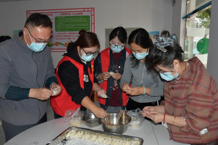 活动中,师生党员们向老人们致以诚挚地节日祝福,并送上牛奶、鸡蛋、水果等慰问品。随后,一场由音乐教育学院师生带来的小型文艺演出在敬老院的小院中拉开帷幕。歌曲、舞蹈、古筝等丰富多彩的节目,赢得了老人们的阵阵掌声。表演节目的同时,其他师生党员和敬老院的工作人员一起动手包饺子。大家分工协作,动作娴熟,配合默契。不一会儿,一排排手工饺子就摆满了餐盘。
