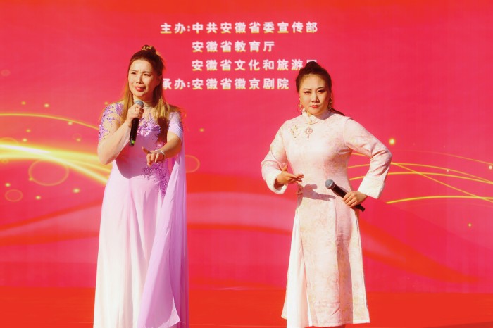 活动现场座无虚席,氛围热烈。主持人严成露的深情开场,瞬间拉近了传统艺术与师生的距离。昆曲经典《思凡》拉开帷幕,表演者赵诗画以婉转唱腔与细腻身段,将古刹少女对红尘烟火的懵懂情愫演绎得淋漓尽致,让观众沉浸式感受昆曲的典雅之美。随后,徽剧《水淹七军》选段《观阵》震撼登场,刘旻凭借高亢激昂的唱腔与威严挺拔的工架身段,再现“武圣”关羽凭高望江、以水为兵的豪迈气魄,尽显徽剧的刚健风骨。