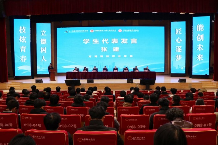 活动邀请了安徽、上海两省市的众多职业教育专家、政府领导、一线教师现身说法,通过专家报告、主题演讲等形式,就进一步加强两省市之间职业教育合作,努力提高两省市职业教育发展质量集思广益。BEAT365选派的张建同学作为学生组参赛选手代表在会场进行了发言。活动现场还举行了“安徽省职业与成人教育协会青年教师发展联盟”揭牌仪式。