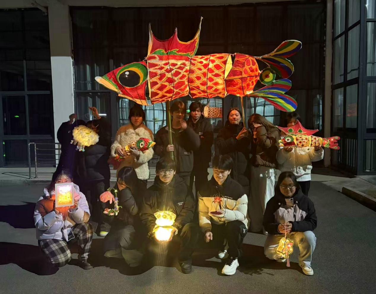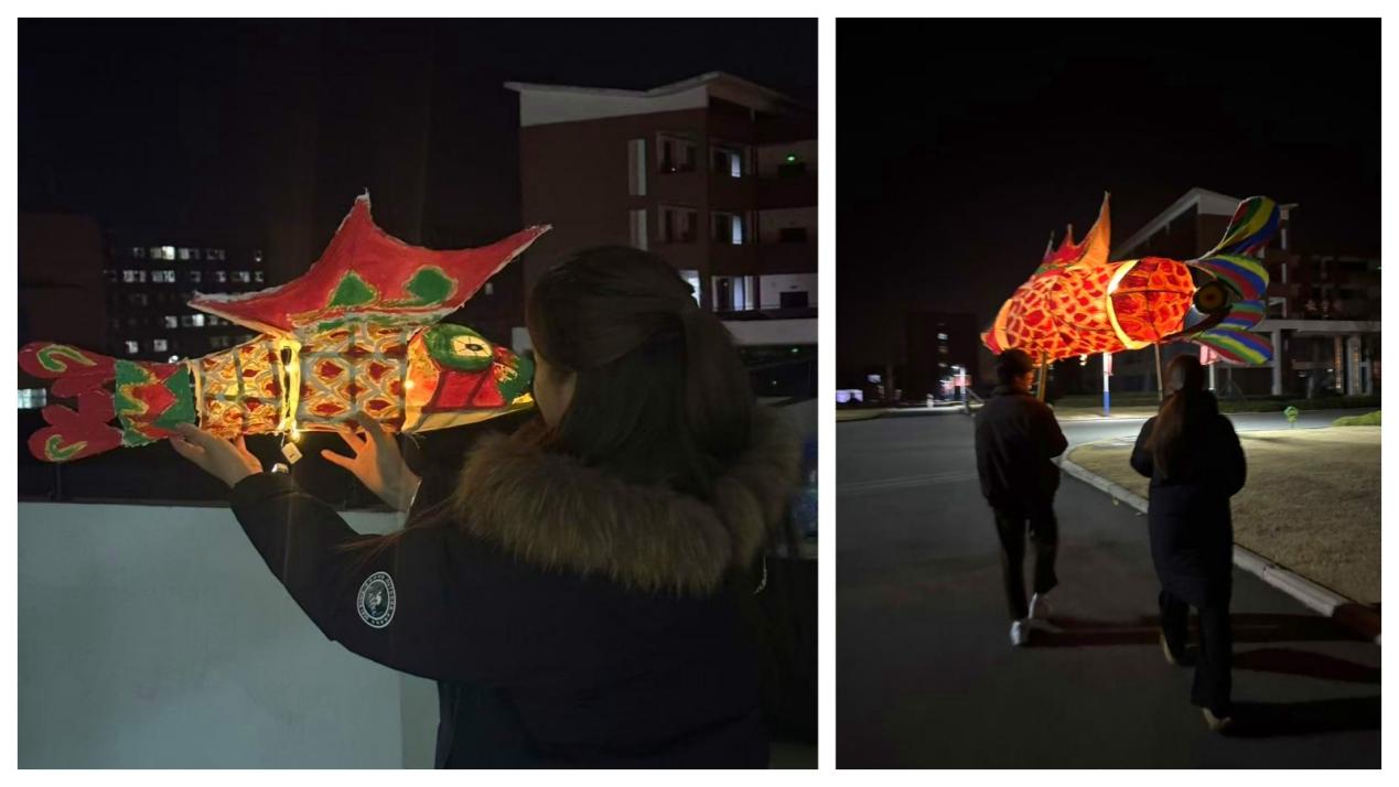 当夜幕降临,鱼灯和各式灯具同时点亮,校园仿佛重现“鱼龙舞”的流动光景。灯光摇曳中,学子们不仅感受到了传统非遗文化的魅力,更在光影交错间体会到艺术创作的成就感与文化传承的责任感。有学生感慨:“制作鱼灯的过程,就像一场与传统的对话,当亲手扎制的鱼灯点亮时,不仅感受到了创作的快乐,更明白了‘匠人’二字的重量,也明白了传统文化需要我们年轻人用心守护、创新传承。”。
