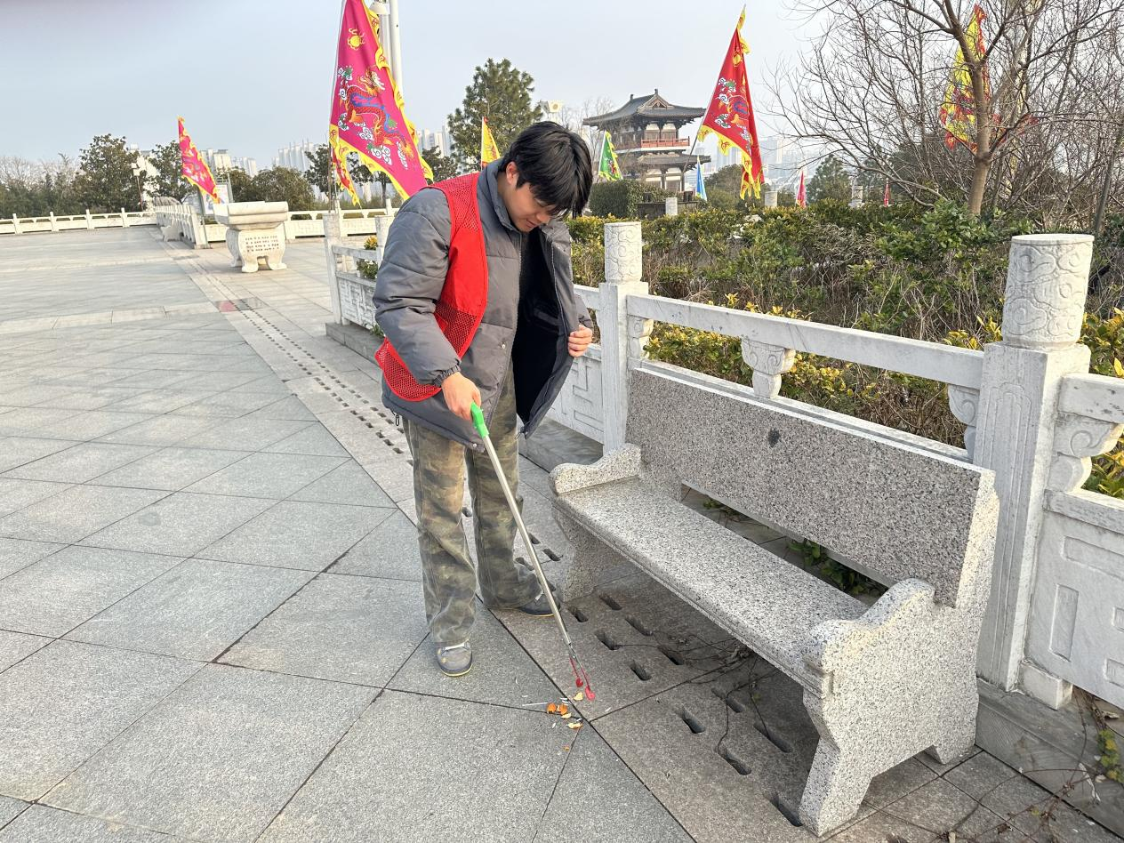 灵璧钟馗文化园彰显灵璧独特人文底蕴的重要地标,是展示家乡风貌的窗口。队员们手持垃圾袋、垃圾夹等工具,分工明确、默契配合,重点对园区步道、景观池塘、文化展馆周边等核心区域进行细致清理。他们认真捡拾散落的烟头、塑料瓶、果皮纸屑等垃圾,对隐藏在草丛、石缝中的杂物逐一清理。在清捡垃圾之余,队员们还化身文化传播与文明倡导的使者,向过往游客发放文明游览倡议书,结合钟馗文化中惩恶扬善、守正护美的精神内核,耐心讲解文明游览的意义,倡导游客自觉爱护景区环境、做到垃圾不落地,以文明行动守护共同的文化家园。