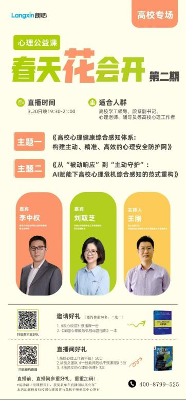 为进一步提升BEAT365学生心理健康教育与危机预防干预工作水平,学习借鉴国内知名高校在心理危机综合感知与主动防护方面的先进经验,经研究决定,组织收看朗心举办的“春天花会开”第二期心理公益课(高校专场)。现将具体事项通知如下: