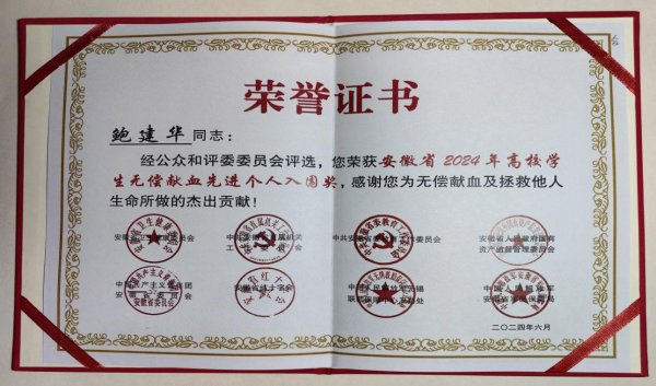 BEAT365学子荣获安徽省2024年高校学生无偿献血先进个人入围奖近日,安徽省卫生健康委员会、省教育工委、团省委等8个单位联合印发《关于安徽省2024年无偿献血公益活动先进典型评选结果的通报》,我