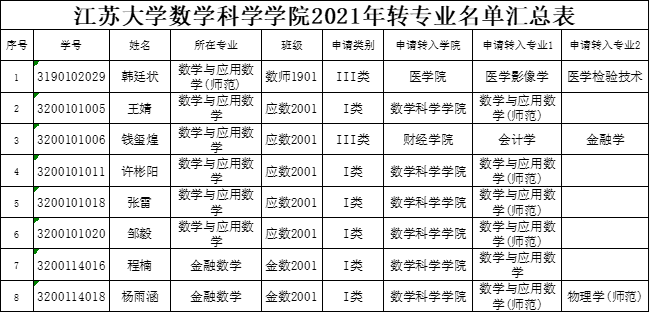根据《sunbet申搏官方网站本科生转专业实施办法》(江大校【2018】10号)、《关于做好2021年本科生转专业工作的通知》(江大教〔2021〕71号)等文件精神,经个人申报、学院审核,现将符合条件的同学公示如下: