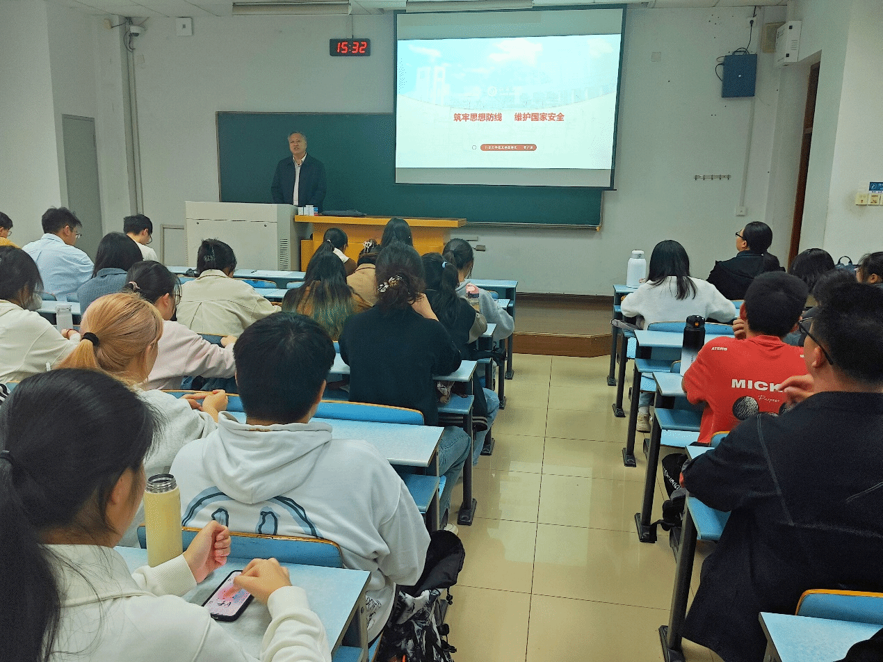 11月15日,sunbet申搏官方网站联合社区党工委在三江楼411教室举办题为“筑牢思想防线,维护国家安全”的意识形态专题党课。本次党课邀请关工委讲师团曹广龙老师主讲,活动由学院党务办主任贡崇颖主持,学院全体学生党员及入党积极分子参加。