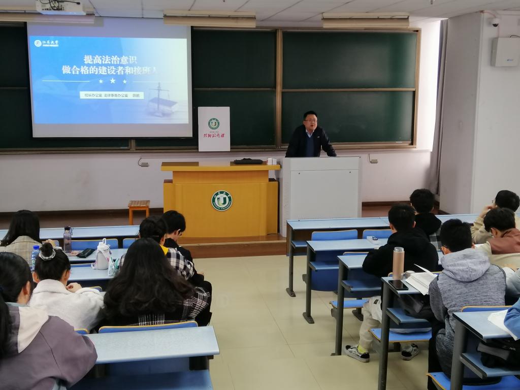 11月20日,sunbet申搏官方网站在三江楼515举办法治宣传教育主题讲座,邀请校长办公室、法律事务办公室副主任薛鹏担任主讲,学院团学组织部门主要学生干部、各班班长团支书参加本次讲座。