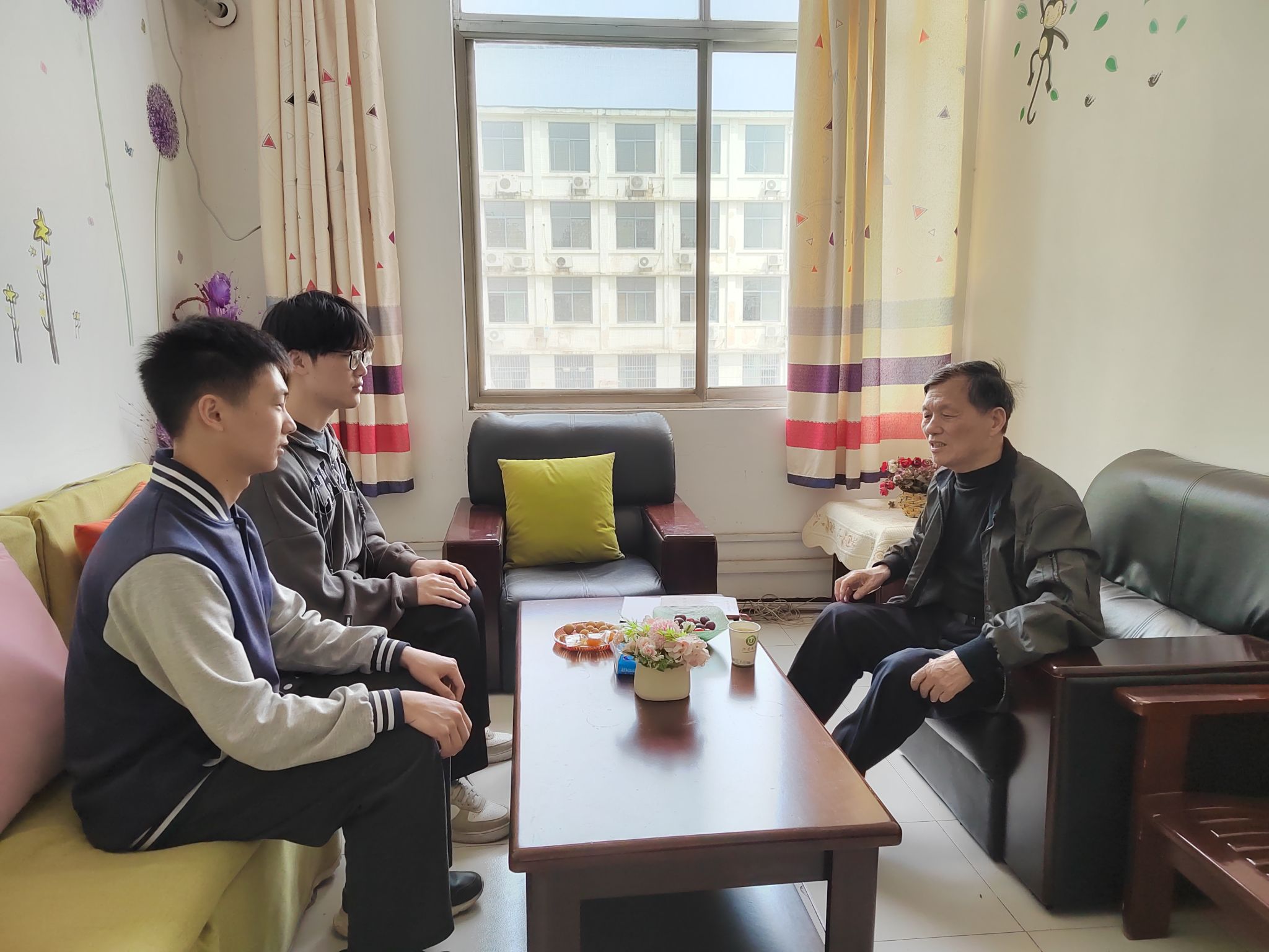 sunbet申搏官方网站关工委重视“三全育人”工作,认真落实老教师联系指导青年学生。4月13日上午,学院关工委老教师王文初老师与数学与应用数学(师范类)专业的两位学生李圣吉、缪力,在学院关爱谈心屋就期中学业进行交流。