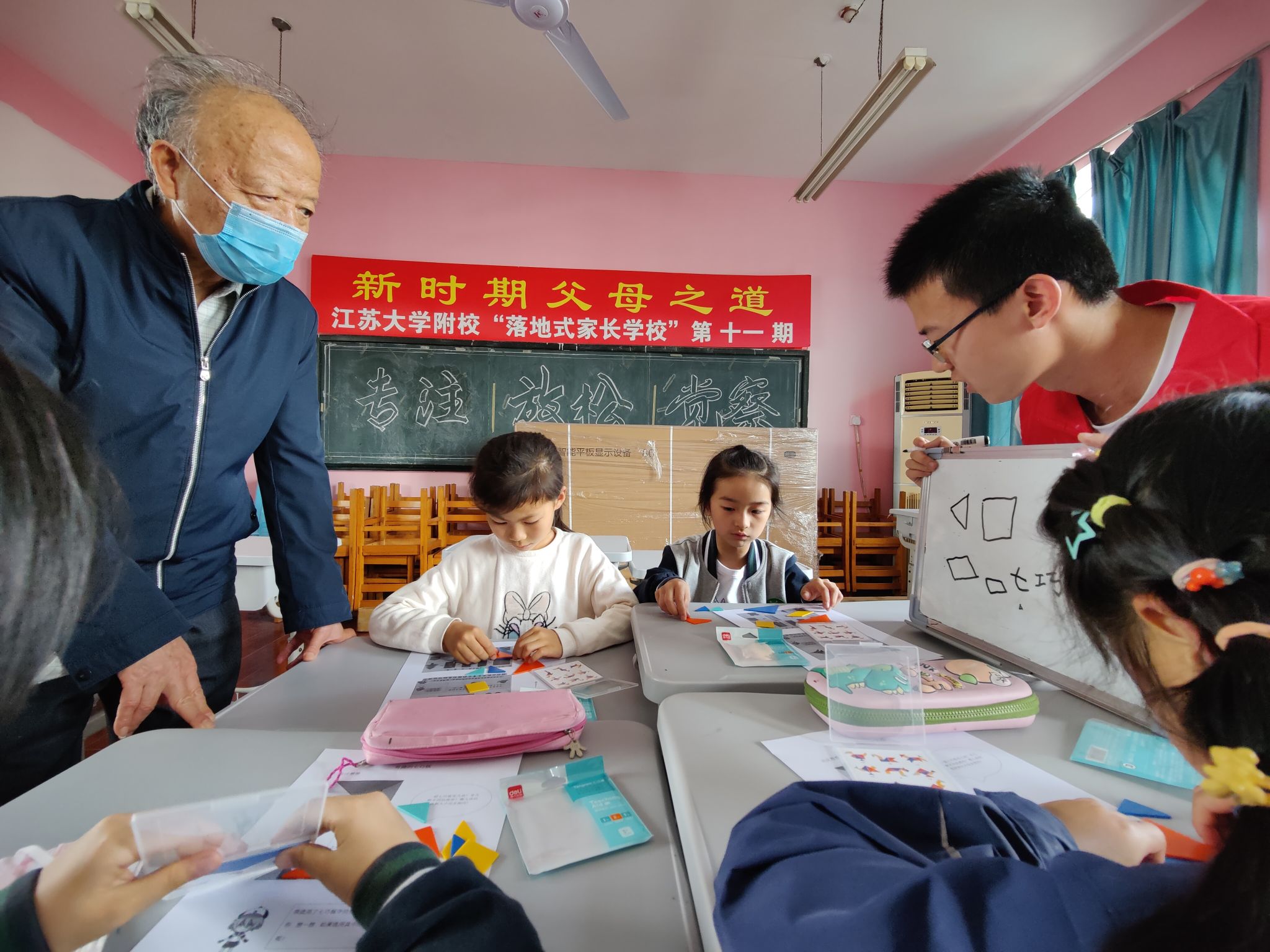 活动过程中,志愿者们根据每组小朋友不同的学习进度,开展相对应的教学活动。聚焦其中一组志愿者,首先带领小朋友认识七巧板,并且引导小朋友们利用七巧板对简单图形进行拼接,后来过渡到对称图形的认识上,在活动中开展数学知识普及,让小朋友们在活动中既收获知识又能体验乐趣。张有德老师则来往于各组小朋友之间有针对性地给予指导,整个活动过程充满了欢声笑语,大家共同度过了一段充实而快乐的课后时光。