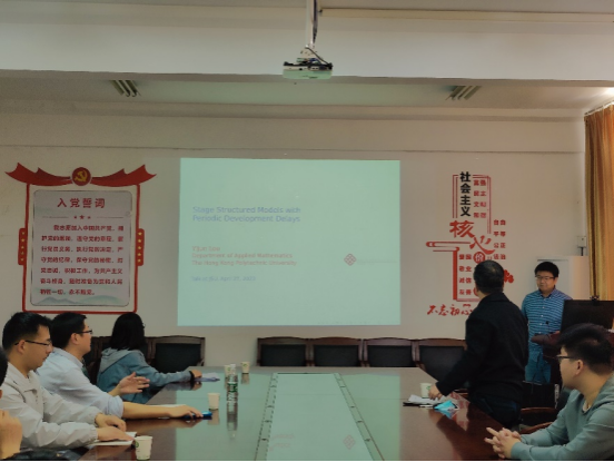 On the morning of April 27, Associate Professor Lou Yijun of the Hong Kong Polytechnic University gave an academic report entitled "Stage Structure Model and Theoretical Analysis with Periodic Development Delay". The lecture was presided over by Professor Zhang Zhitao, Dean of the School of Mathematical Sciences, and attended by Professor Wang Jun, Vice Dean, teachers and graduate students in biomathematics, applied dynamic systems and control and other related fields.